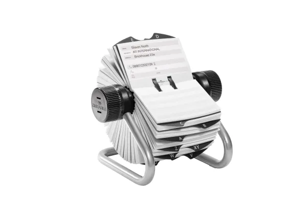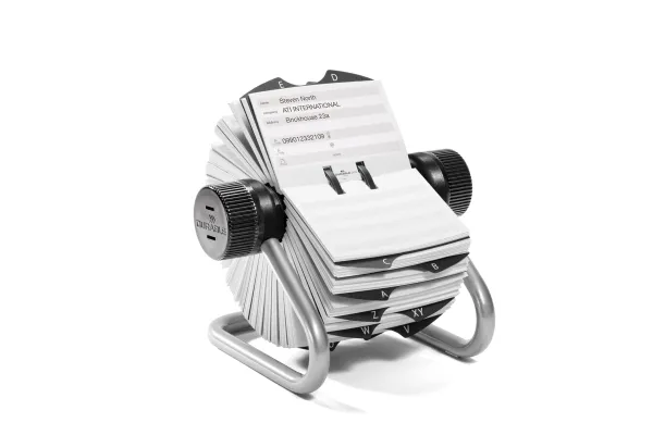 Rullkortsregister för telefonnummer och adresser. Med mjuk rotation och låsfunktion. Levereras komplett med 500 dubbelsidiga registerkort (104x72 mm) och 25 indelade registerflikar A-Z. Lätt att ta bort och sätta in registerkorten.