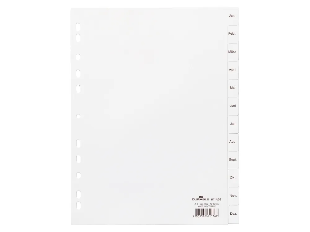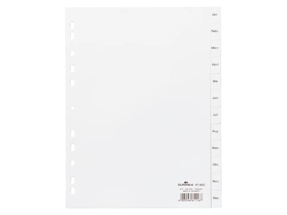 Universalhullet 12-delt register i 0,12mm pp-plast med trykte faner Jan-Dez (tysk forkortelse af måneder). Kartonforblad med skriveområde.