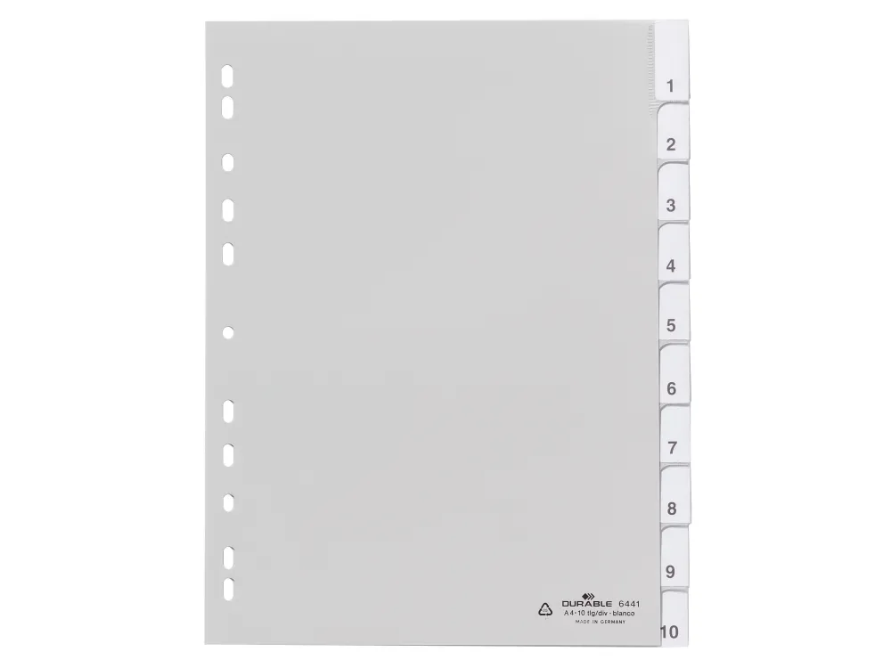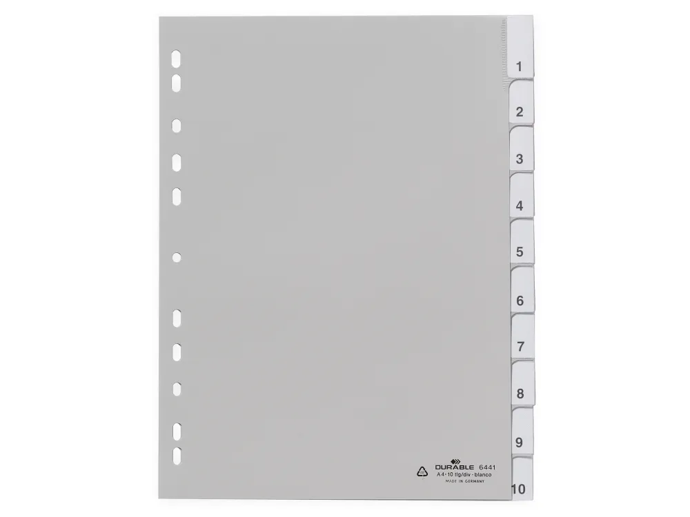 Universalhålat insticksregister 1-10. Försättsblad, blanka instick samt blanka instick med färgkod medföljer. Använd DURAPRINT online som hjälper dig att skriva ut personligt designade etikettfickor och registerflikar.