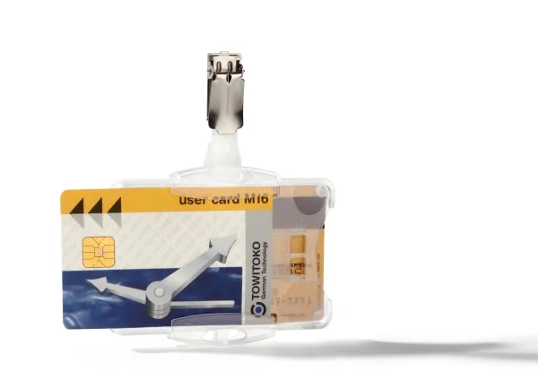 Dual Security Pass Holder with rotating clip fastener. Securely holds two ID cards in portrait or landscape format. Can be combined with chains, textile necklaces and badge reels.