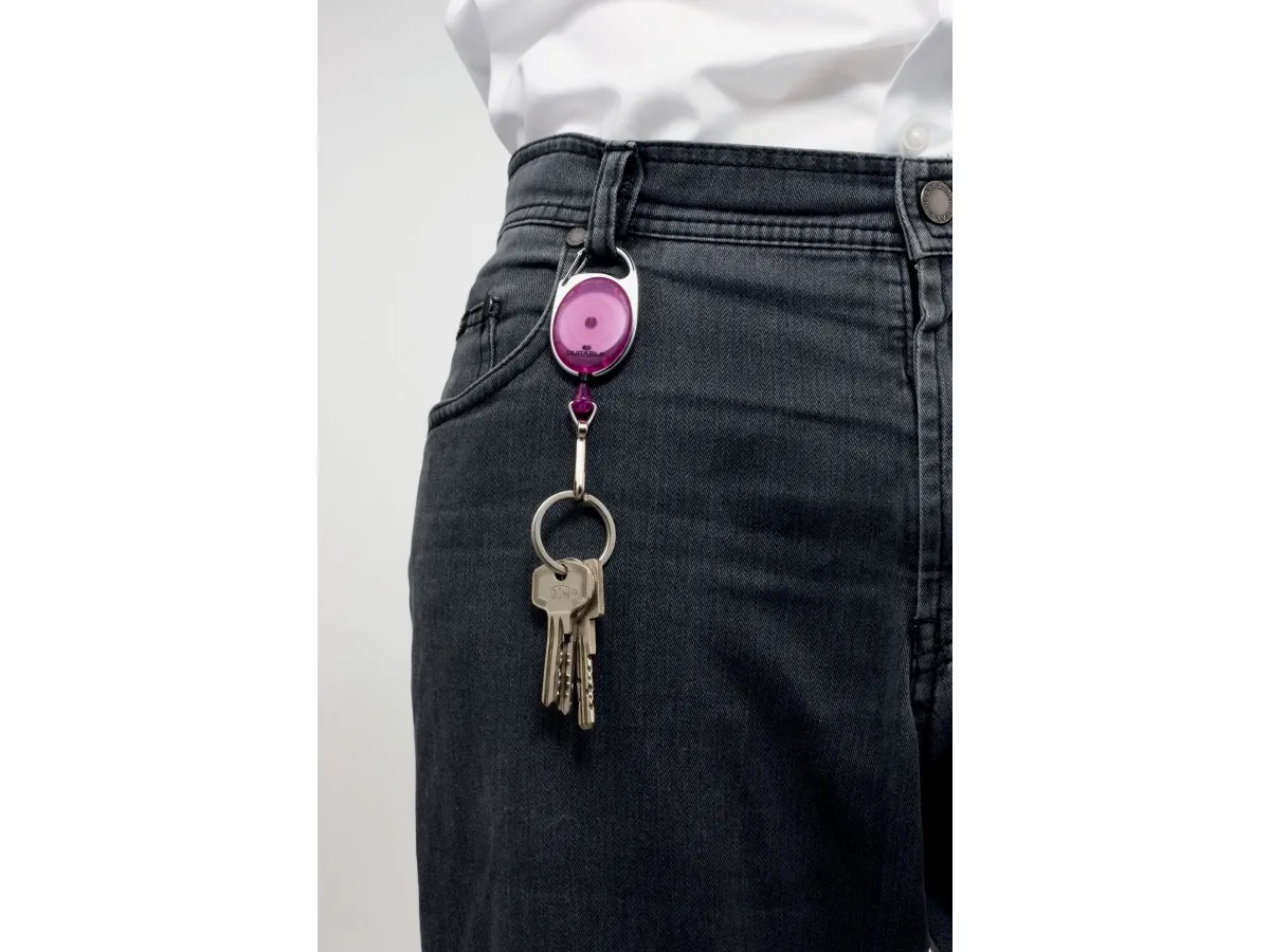 Yoyohållare med metallkrok, lämplig för namnbrickor och korthållare med hål. Toppklämma för fastsättning på byxremmen. Kan förlängas till 80 cm längd. Individuellt förpackad i blisterpåse.
