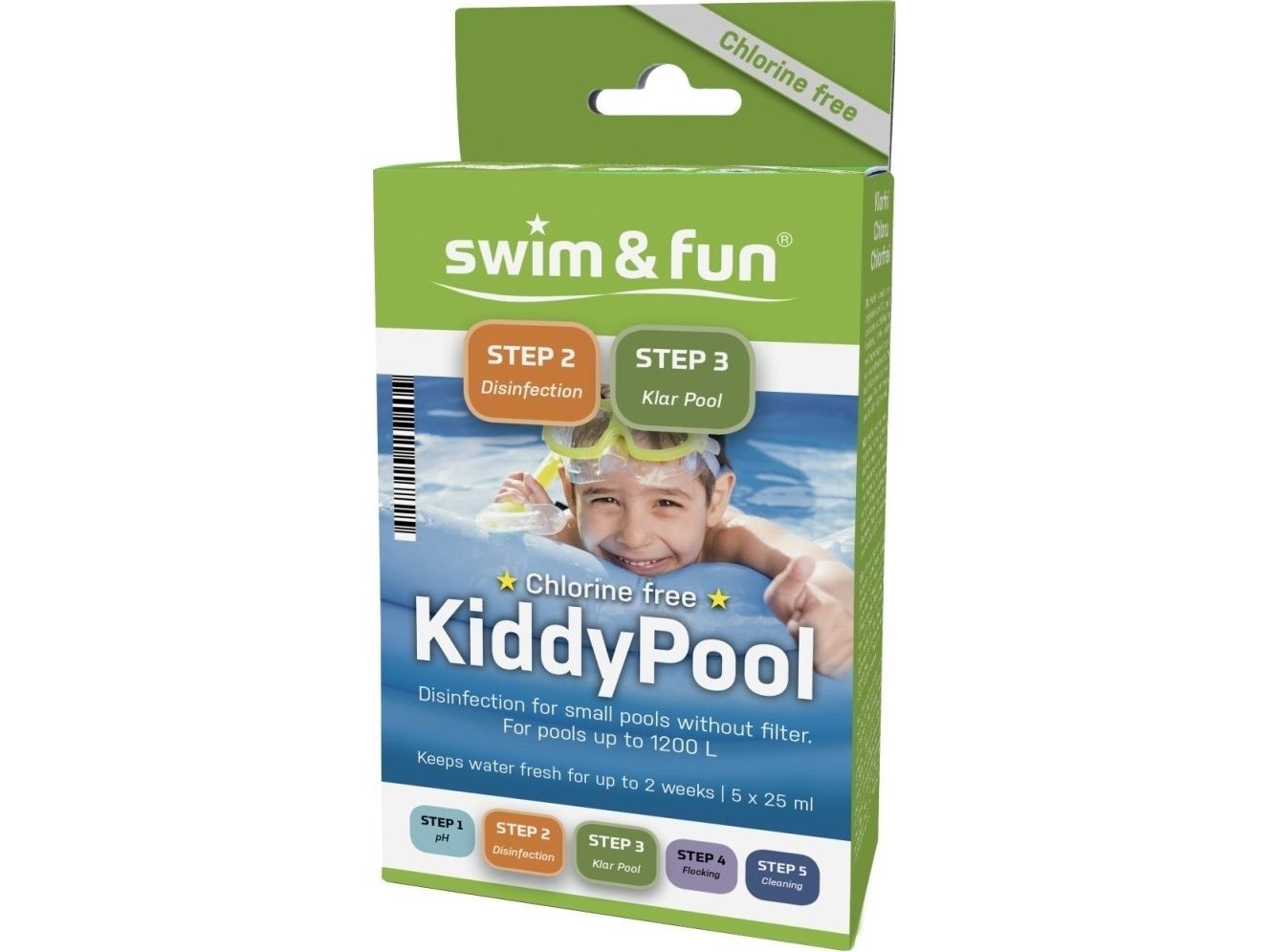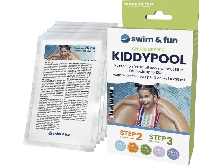 Oavsett storleken på poolen är det en bra idé att se till att vattnet är hälsosamt och inbjudande. I en plaskdamm blir vattnet snabbt ljummet och det skapar extra gynnsamma tillväxtförhållanden för bakterier och alger. KiddyPool desinfektion är en lättanvänd klorfri vattenvårdande produkt för plaskdammen.