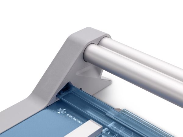 - Helpful format lines on the base with mm division along the cutting edge make aligning the material to be cut even easier - Stable metal base with non-slip rubber feet to keep the rotary trimmer securely in place - Automatic clamping on the cutting line to quickly fix in place the material to be cut - Convenient rotary trimmer for professional use - Double guide bar for absolutely accurate cutting - Self-sharpening steel rotary blade enclosed in safety cutting head, ground and hardened - Ground lower blade of hardened steel - Rotary blade in closed, ergonomic plastic head - Two scale bars - Adjustable backstop for quickly finding the right format - Rear feet for space-saving upright storage - High-quality blade made from hardened steel for long-lasting cutting quality