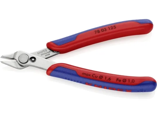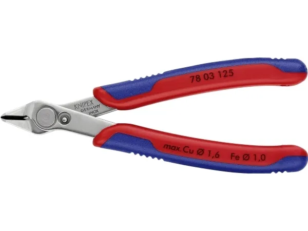 Precisionstång för de finaste skärarbetena, t.ex. inom elektronik och finmekanik. Slipade, mycket vassa kanter utan fas. Precisionsformade spetsar skär även angränsande trådar från Ø 0,2 mm. Skärkant med kontrollerad förskjutning av mikroskärkant, vilket garanterar lång livslängd och ytterst exakta skärningar, även på de tunnaste trådarna. Ledad med nit i rostfritt stål. Extremt lätt att använda, så att arbetet inte blir slöt. Med öppningsfjäder och öppningsbegränsning. Skärhårdhet ca. 54 HRC. INOX-verktygsstål. SB-backing/blisterförpackning