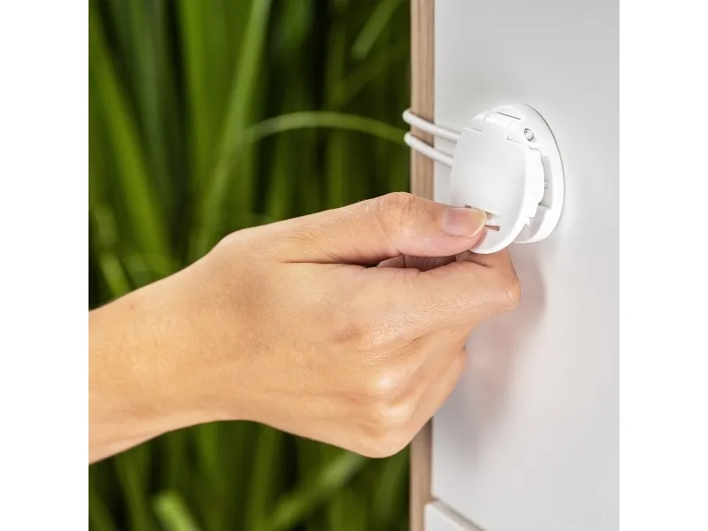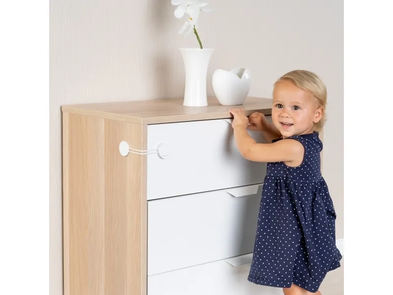 Reliably locks cupboards & drawers from curious children’s hands\nThe contents of cupboards and drawers, as well as dishwashers, refrigerators and microwaves, are particularly exciting for children. Once they learn to crawl and walk, they can easily reach handles and objects that do not belong in children’s hands, such as knives or poisonous cleaning agents.\nThe reer multi- lock helps you to protect your little one from danger by allowing you to lock a variety of objects, including cupboards and other storage, in a childproof way.\n\nQuality and safety tested according to strict testing standards\nTo offer babies and toddlers maximum protection, reer products are controlled in accordance with strict testing standards. The item not only goes through in-house tests, but is also tested by independent institutions. Our multi-lock has been tested according to the current standard EN 16948:2017.\nIt has successfully passed hold tests, longevity tests and stress tests. Even under heavy loads, the multi-lock retains its adhesive strength and sits securely on the piece of furniture. Even after long-term use, the opening mechanism remains difficult for children’s hands to open. The stability of the material remains constant and thus prevents the multi-lock from breaking, even after more than 5000 openings. Only multi-locks that have been tested according to this standard offer sufficient and secure hold and ensure safe operation even after long periods of use.\n\nUniversally applicable for cupboards, drawers and much more\nThe safety lock can be attached to any piece of furniture that allows for corner mounting. It allows you to reliably lock cupboards and drawers in which, for example, medicines or sharp objects such as knives or scissors are stored. In addition, electrical appliances such as refrigerators, dishwashers and microwaves can also be secured. This prevents your child from coming into contact with fragile objects and the refrigerator from defrosting due to accidental opening. Thanks to its simple, modern design, the multi-lock is suitable for every type of home.\n\nEasy to open and close convenient operation for adults\nWith the reer multi-lock, cupboards and other similar objects are kept safely locked up, away from any small explorers. For adults, though, it can be easily opened with one hand. To do this, simply push the small slider downwards and lift the lock upwards. The band can then be removed from the locking element and the piece of furniture opened as usual.\n\nEasy and quick installation no drilling or screwing\nThe multi-lock can be attached quickly and easily thanks to the specially developed safety performance tape provided. The adhesive tape ensures a secure hold and residue-free removal of the multi-purpose safety lock when it is no longer needed.