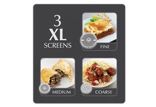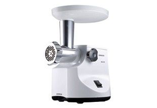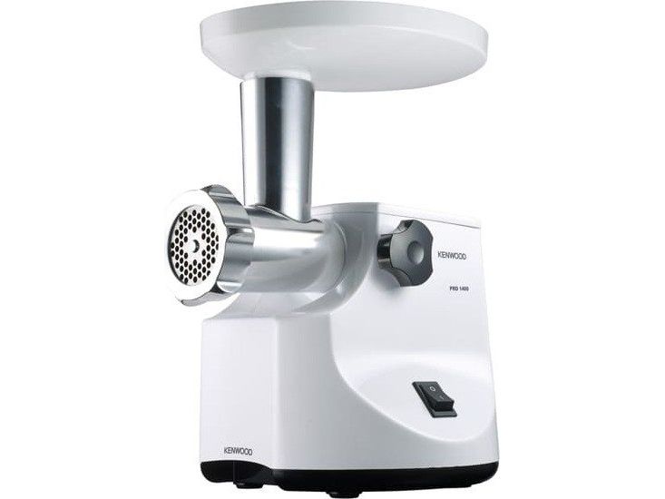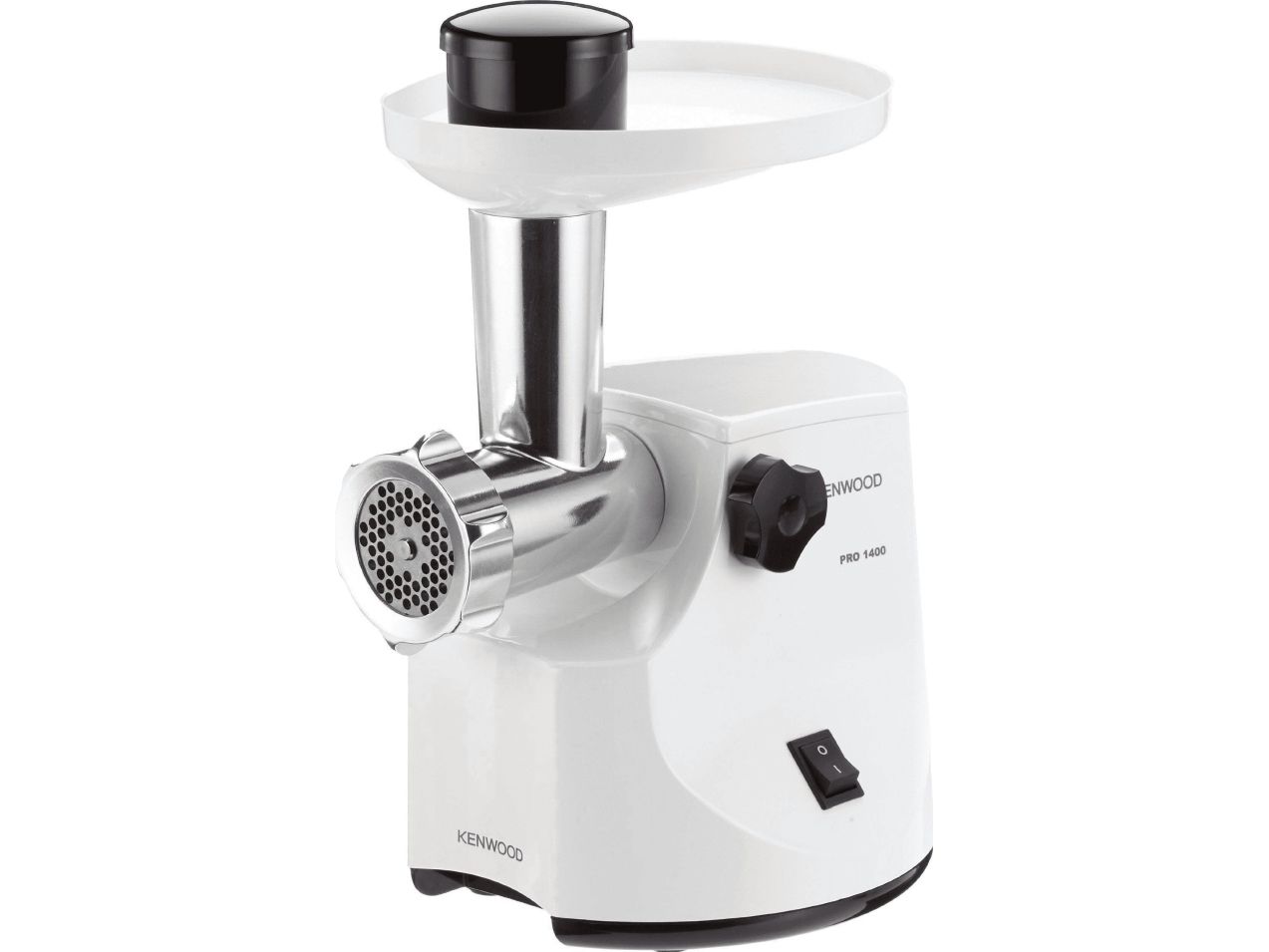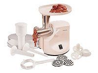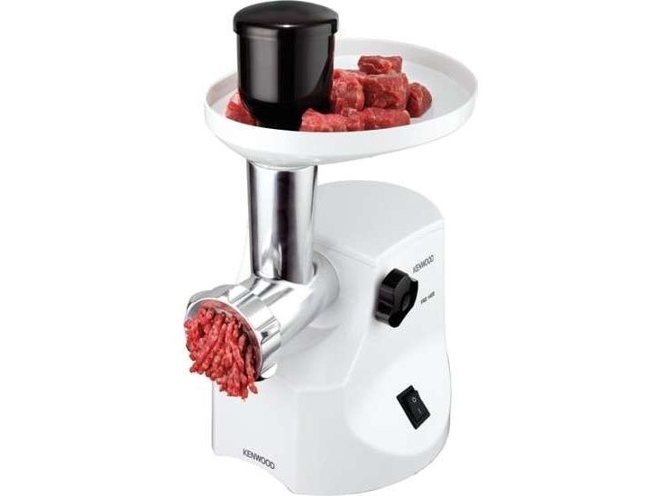 On, off and reverse switch, three screens for fine, medium and coarse results. Sausage and kebbe maker attachments stored in the pusher.