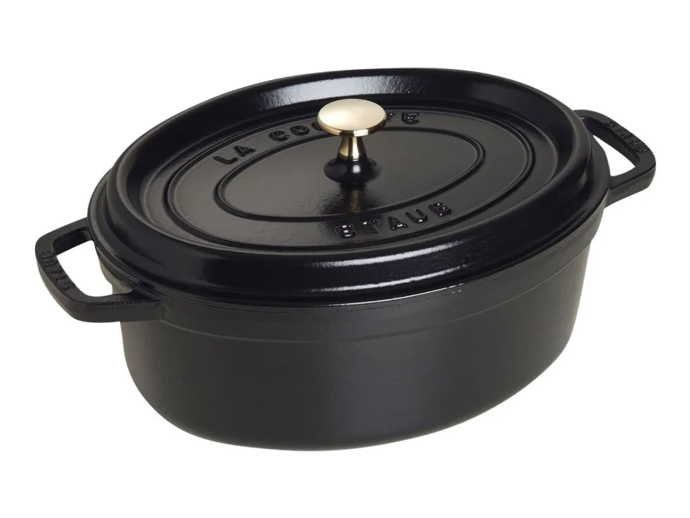 In the oval Staub cocotte you can make delicious stews of all kinds, such as hearty goulashes or French specialities, for example. These type of pots were specifically developed in France for slowly casseroling food. They allow the flavors to develop fully and so intensify the taste of ingredients. The cooking pot is made of cast iron, which ensures particularly uniform heat distribution and retention. It is also enameled inside, which reinforces the excellent stewing properties of cast iron. This enamel is matt black in color and is a pleasant contrast to the graphite gray pattern on the outside. So you can use the cocotte to serve at the table. It has several advantages: As well as looking good, food remains hot for a long time. The cocotte is suitable for any kind of hob, including induction cookers. You can also use it in the oven for recipes with longer cooking times.