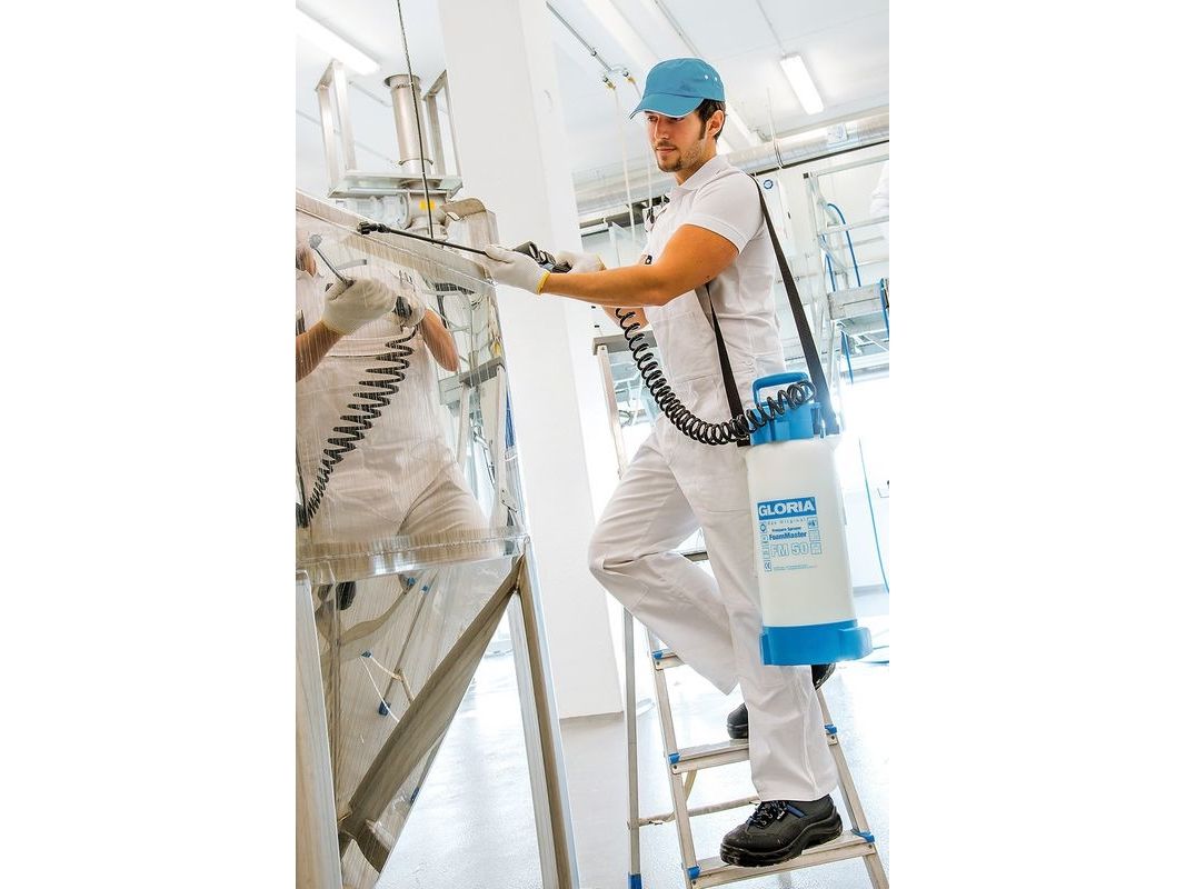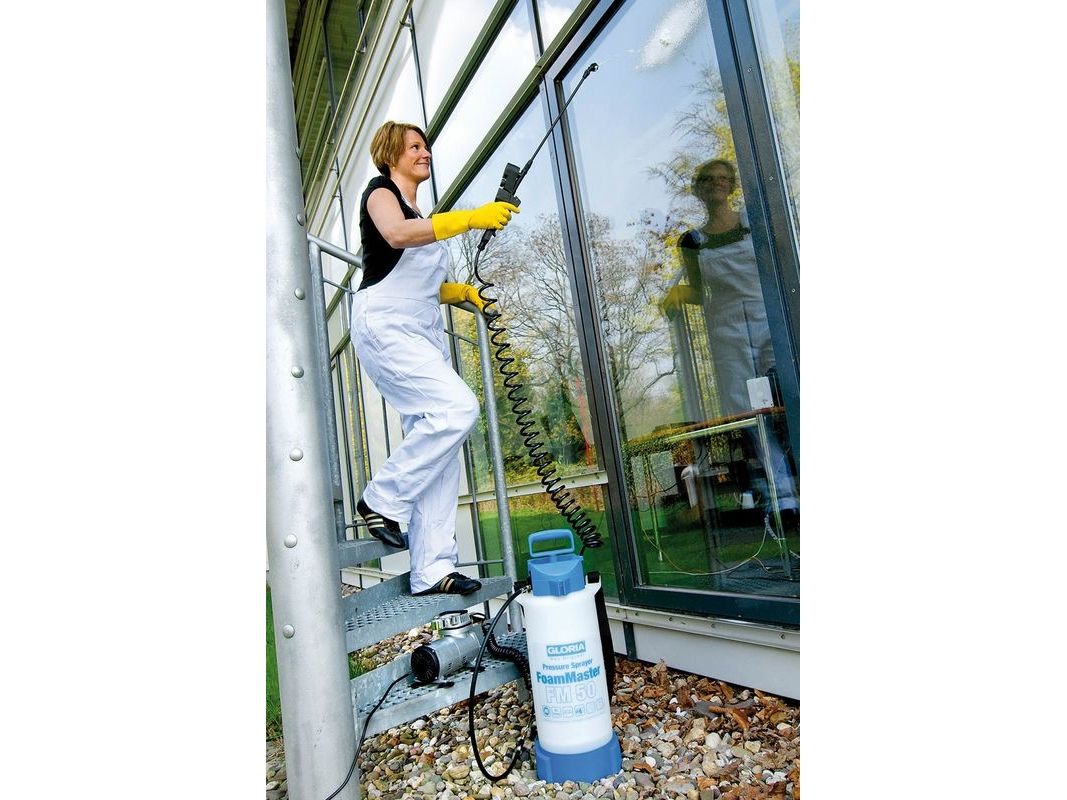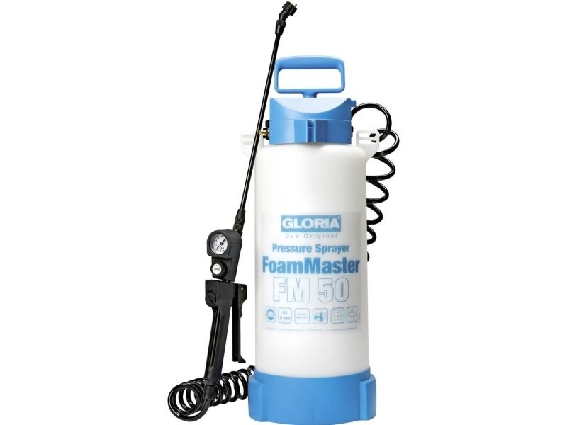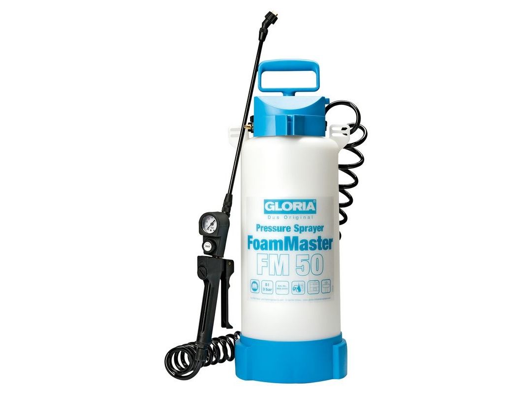 Tryksprøjteapparat FoamMaster FM 50Viton (FKM) pakninger · Plast-dyserør · Plasticpumpe · Spiralslange · Integreret sikkerhedsventil · Skumsprøjte · Kompressortilslutning. 5 L tryksprøjteapparatet Gloria FoamMaster FM 50 er udstyret med modstandsdygtige Viton-pakninger samt en fladstråledyse med en 110° sprøjtevinkel og forvandler rengøringsmiddel til effektivt renseskum, der virker intensivt på overfladen, og som opnår et endnu grundigere rengøringsresultat. Desuden er der økonomisk rengøringsskum til anvendelse og sørger for en betydeligt lavere anvendelse.