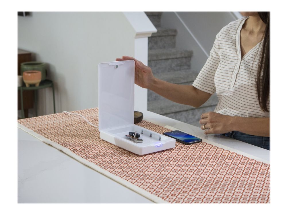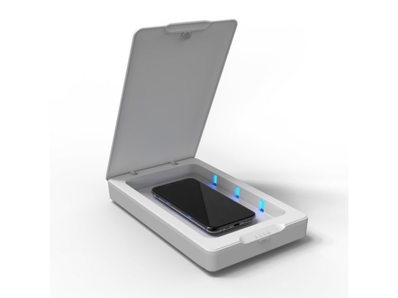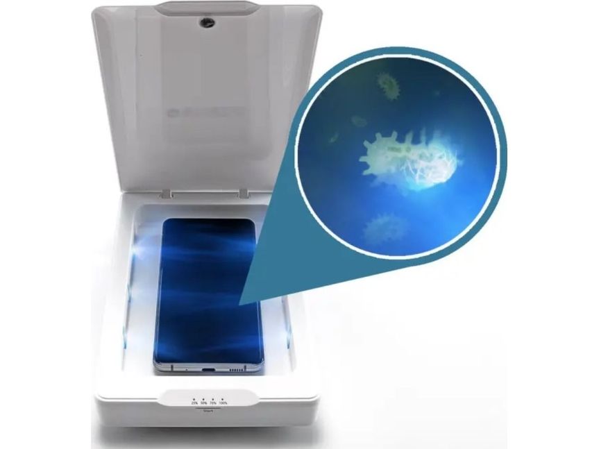 InvisibleShield UV Sterilizer regör dina enheter med UV-C ljus och eliminerar upp till 99. 9% av Staph och E. Coli bakterier på alla platser det kan vara svårt att komma åt utan att använda värme, vätska eller kemikaler som skulle kunna skada din enhet. Placera bara den valda enheten i rengöraren, stäng locket och tryck på start. Rengöraren är kompatibel med smartphones upp till 6,9" och är också kompatibel med bilnycklar, smycken, hörlurar, klockor, nappar och andra föremål i denna storlek. Rengöringen tar 5 minuter och sköts med bara ett knapptryck. UVC 254nm ljusbehandling med 6x UV-lampor.