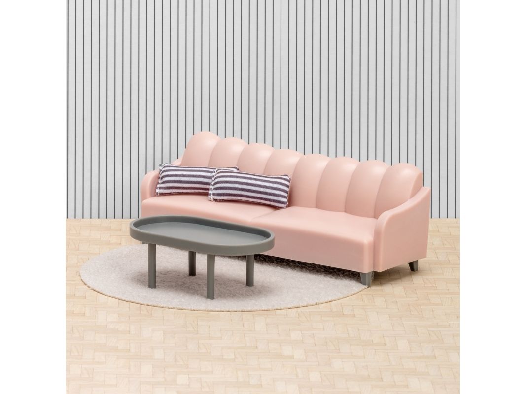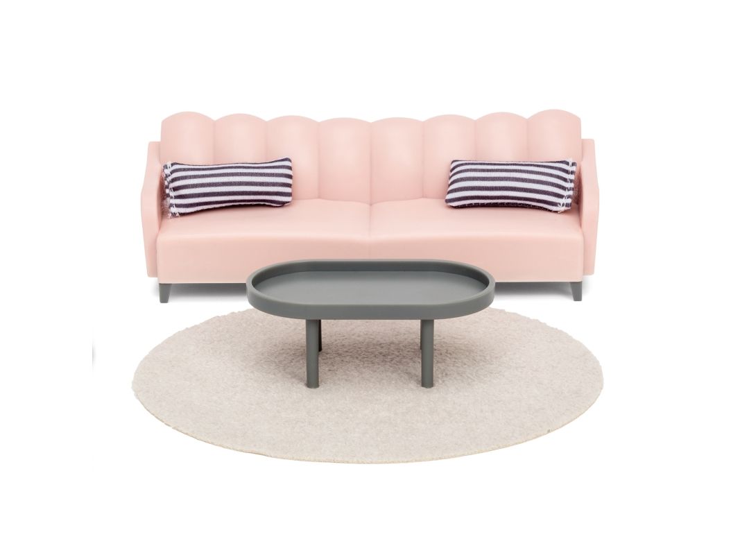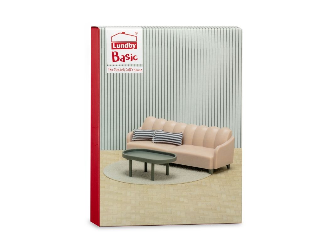 Ett rum för alla! I vardagsrummet kan hela dockhusfamiljen umgås och ha kul tillsammans. En snygg soffa med två medföljande kuddar. Soffbordet har en smart liten kant som gör att saker lättare håller sig på plats. I det här fina setet ingår också en rund matta att placera på golvet, eller varför inte använda den som en mysig filt? Med Lundby Basic kan du snabbt och lätt möblera ditt Lundby dockhus. Uppfyller kraven i leksaksstandarden EN71 och gällande kemiska regelverk REACH och SVHC.