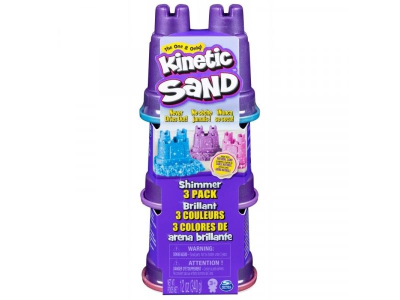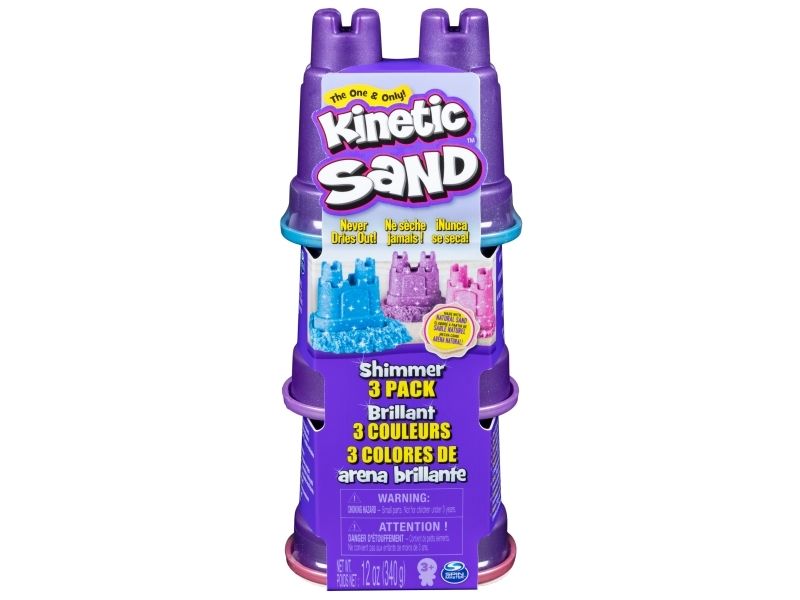 Create a glimmering, shimmering, dazzling creation with Kinetic Sand’s Shimmer 3 Pack! For the first time ever, you can collect three different shimmering pastel shades of the magical moldable sand you can’t put down! Each shimmery color comes in a castle-shaped container that doubles as a re-useable mold! Make a glitzy Kinetic creation, then build again and again! With sand that never dries out, the possibilities are endless! Free of gluten, casein and wheat, Kinetic Sand is fun and safe for everyone! Squish, shape and create!