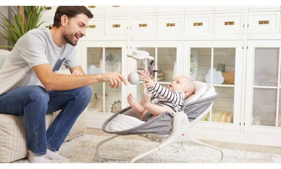- ONE-CLICK SHIFT TO NAPPER: Easily converts into comfy napper with just one click. - 3 RECLINING POSITIONS that are perfect for playing, exploring, napping, feeding and, later, tasting solids in a convenient position. - NURTURES COMMUNICATION: Raised angle offers an excellent position for enjoying some face-to-face time with baby, talking, communicating and bonding. - PROMOTES EQ: Uniquely designed rocker that soothes babies with a cozy environment and calming rocking movements that support baby's development of EQ. - ENCOURAGES FINE MOTOR SKILLS: Cute hanging toys amuse babies, encouraging them to practice their grasp and hone their fine motor skills. - SAFE & COZY ENVIRONMENT features soft pad with raised borders and premium fabrics.