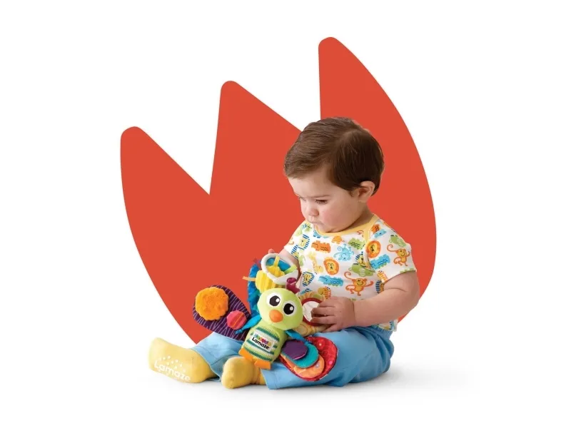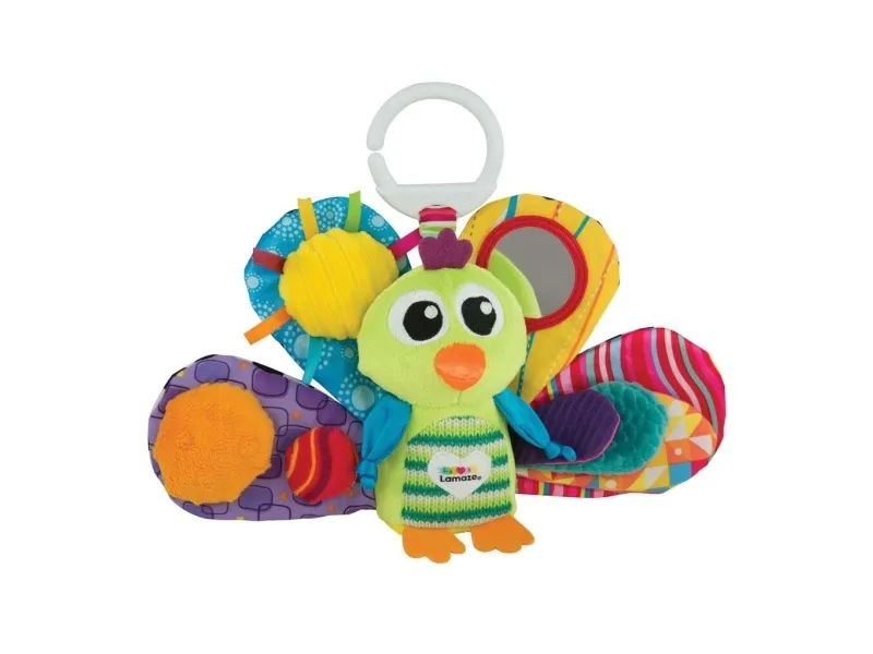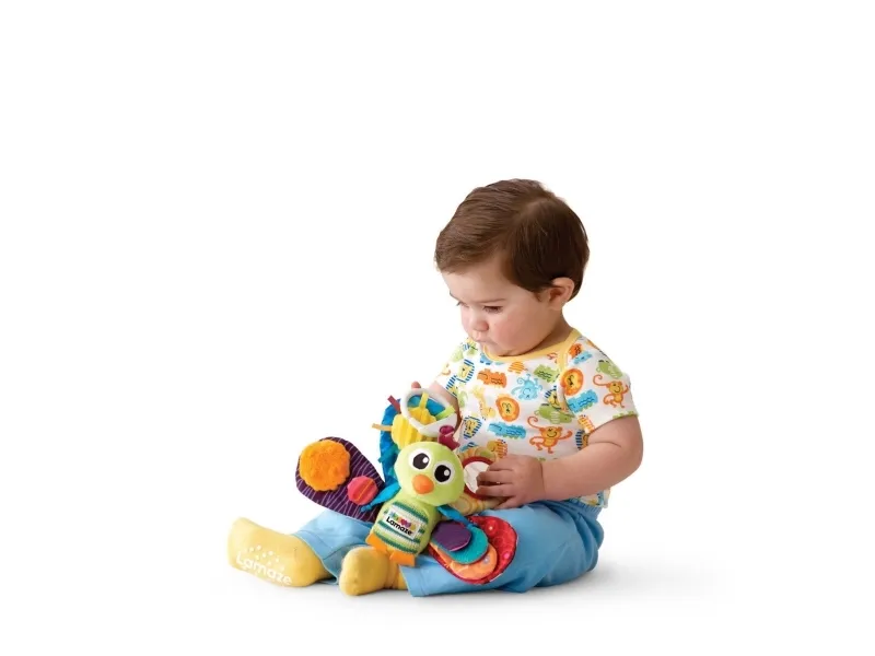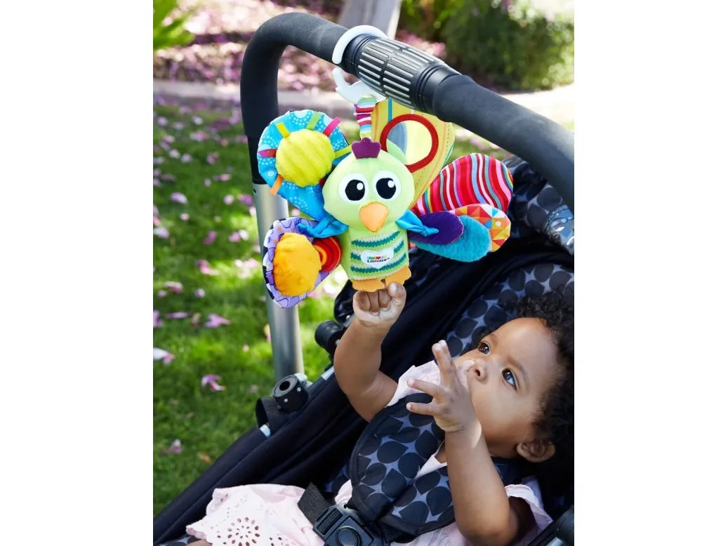 Din bebis skulle älska timmarna av färgglad lek med jacques the peacock! Denna färgglada påfågel hjälper bebisen genom de första, viktiga stegen i den sensoriska utvecklingen. Jacques fyra fjädrar i starka färger stimulerar bebisens syn. Var och en har en egen design. Babyn kommer att vilja röra vid, greppa tag i och hålla velour-kroppen, som känns mjuk att röra vid, och som har flera olika texturer och de prasslande fjädrarna. När man skakar honom, överraskar Jacques bebin med ett skallrande ljud. Alla dessa funktioner är ett utmärkt stöd för utvecklingen av din nyföddas öga-hand-koordination och sensoriska stimulering, och den ger dessutom fantasifull lek. Den vänliga designen och det tokiga leendet kommer att få din bebis ögon att lysa varje gång hen ser det. Kläm fast denna bebisleksak vid en sittvagn, barnvagn eller bilbarnstol så håller den ditt barn roat medan du handlar eller på resan. För Jacques är mjuk, har inga skadliga områden eller ytor och innehåller inga delar som är små nog att stoppas i munnen. Jacques är en idealisk present till en babyshower eller till den nyföddas första jul - ge en present som bidrar till inlärning och tidiga upptäckter! Om denna artikel mot förmodan inte uppfyller dina förväntningar levereras den med 100 % pengarna-tillbaka-garanti! Förpackningen innehåller 1 x play & grow Jacques the Peacock-leksak.