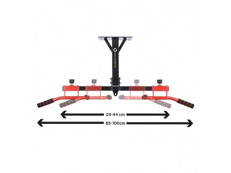 Gummi placeres på stangens håndtag for at forhindre, at hånden glider. Takket være dette får vi et fast greb, hvilket er meget vigtigt under pull-ups. Dette har en direkte indvirkning på sikkerheden og komforten ved brugen. Bredden på håndtagene justeres let og hurtigt, og der er 5 niveauer.