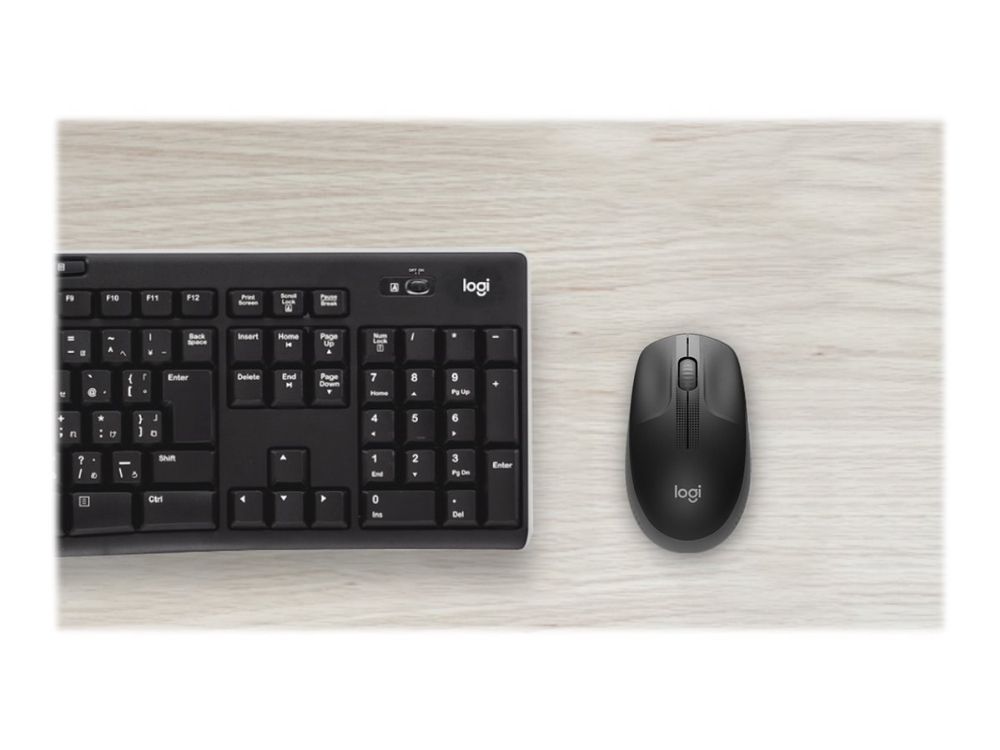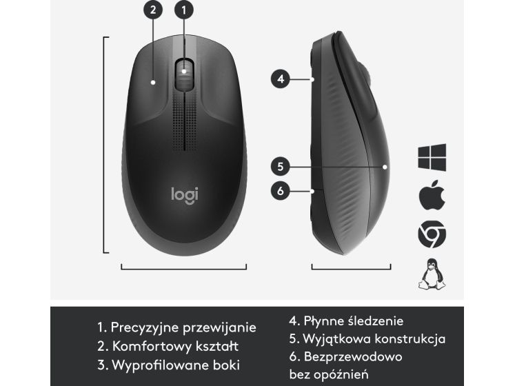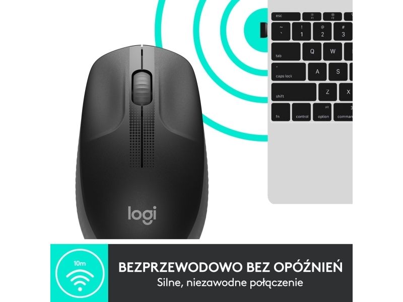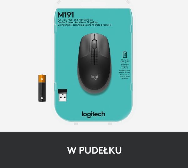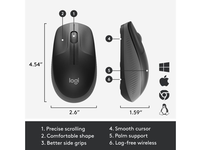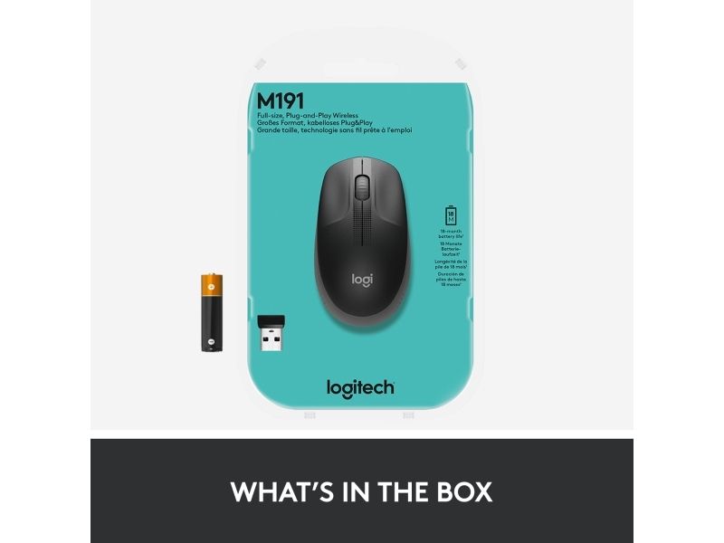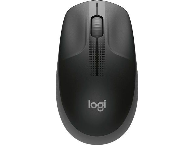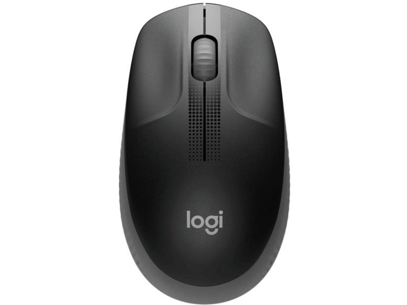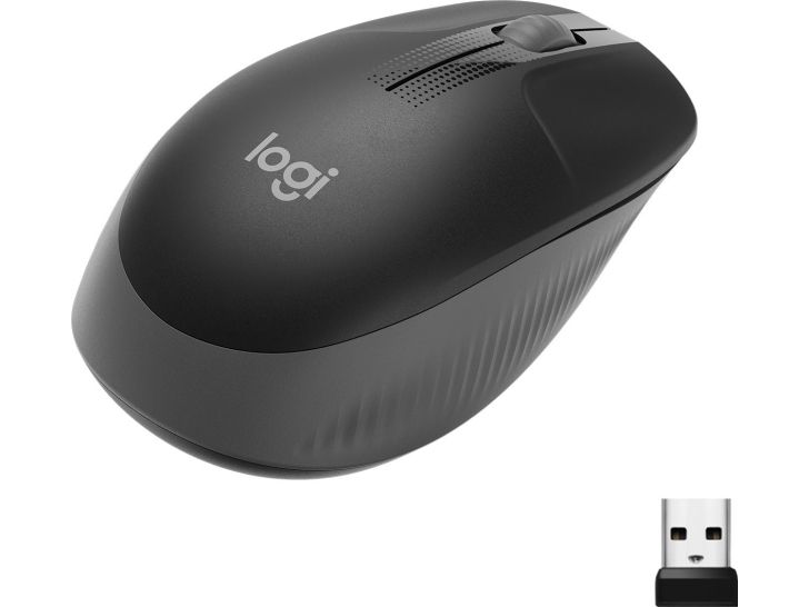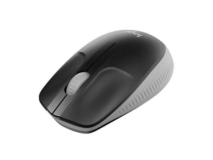 Logitech M190 is a full-size wireless mouse with a comfortable contoured design that follows the natural curve of medium to large hands.