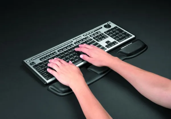 The Fellowes Keyboard Palm Support with patented Health-V Channel relieves wrist pressure to help prevent carpal tunnel syndrome! Self-adjusting memory foam support with contoured shape encourages correct ergonomic position while placing small or large hands in neutral posture. Microban antimicrobial protection keeps product cleaner. It features soft, breathable jersey fabric cover.