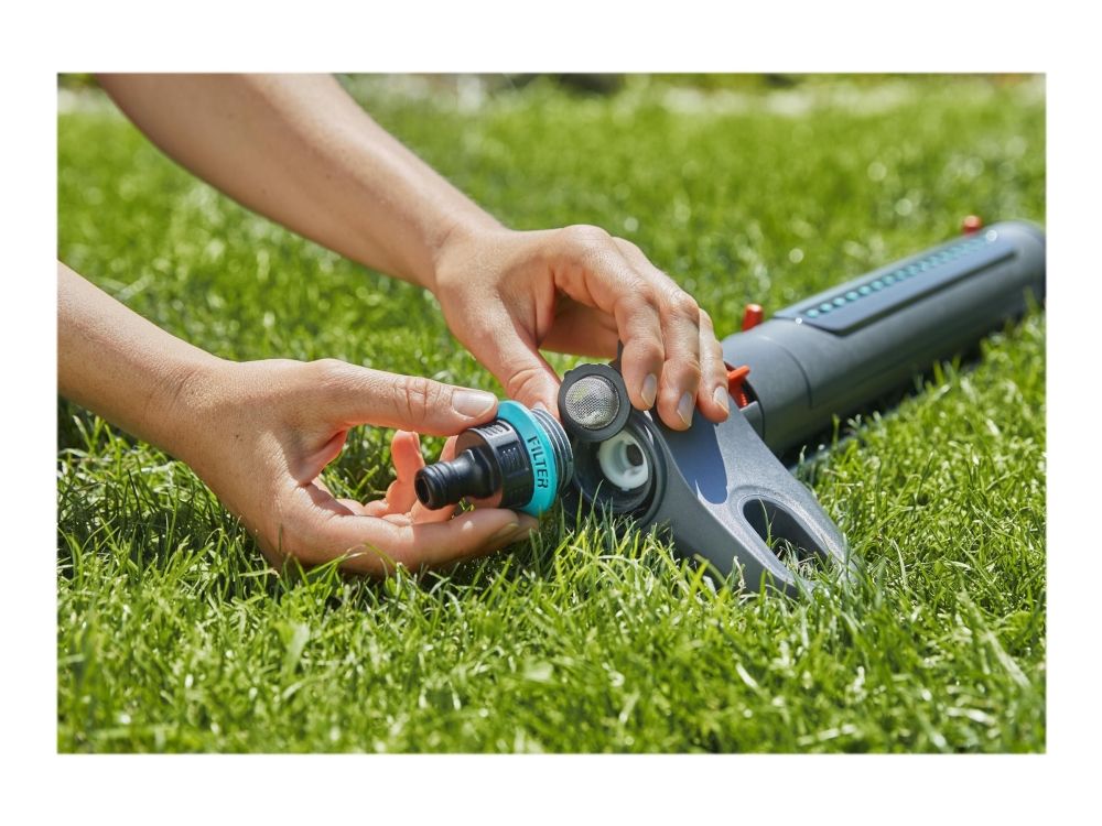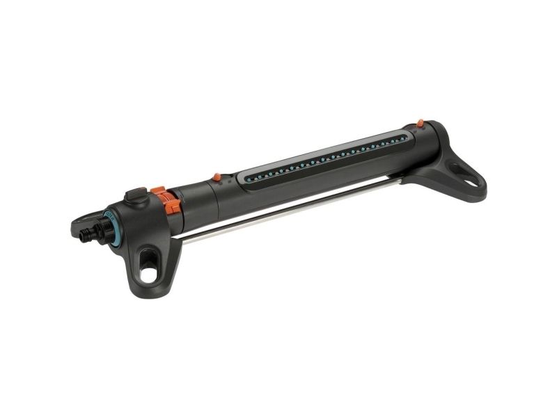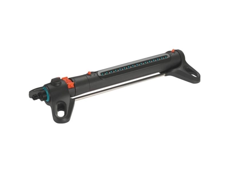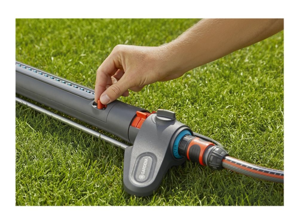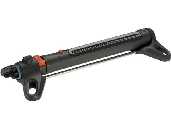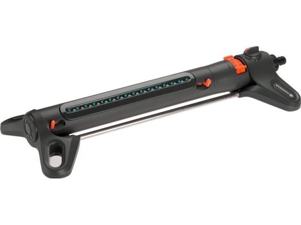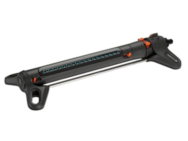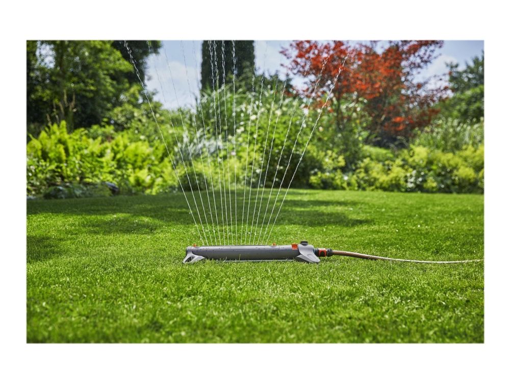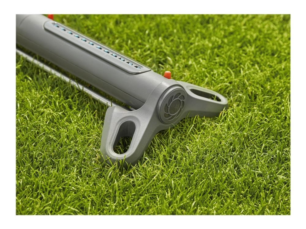 Oscillerande vattenspridare AquaZoom M från GARDENA säkerställer att gräsytor på mellan 9 och 250 m² alltid förses med en jämn och exakt mängd vatten utan pölbildning. Valmöjligheterna är många - använd reglagen för att ställa in till exempel räckvidden (3 - 18 m), bredden (3 - 14 m) och vattenflödet, så att vattnet hamnar precis där det ska. Om du vill kan du välja att bara vattna åt ena hållet. Den här användbara hjälpredan ser till att gräsmattan växer och frodas. Tack vare de två extra breda stöden står spridaren stabilt. Högkvalitativa detaljer i bland annat metall bidrar till att göra AquaZoom M såväl hållbar som tålig mot UV-strålning och frost. Munstyckena är tillverkade av mjukplast och kan enkelt rengöras från t.ex. kalkavlagringar bara genom att torka av dem med fingret. Smutspartiklar fångas dessutom in i det inbyggda rostfria metallfiltret, så att de inte kan ta sig in i AquaZoom M. Du behöver bara vrida ur vattenkopplingen för att kunna plocka ut filtret och skölja av det under rinnande vatten.