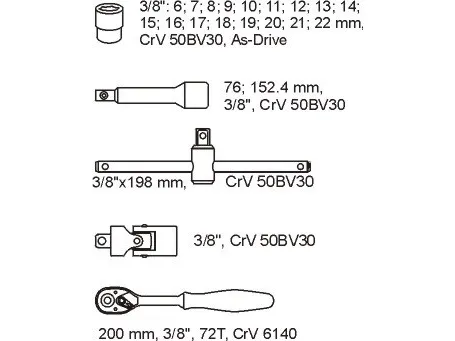 Yato YT-5542, Hylssats, 3/8", Metrisk, 17 huvuden, 6,7,8,9,10,11,12,13,14,15,16,17,18,19,20,21,22 mm