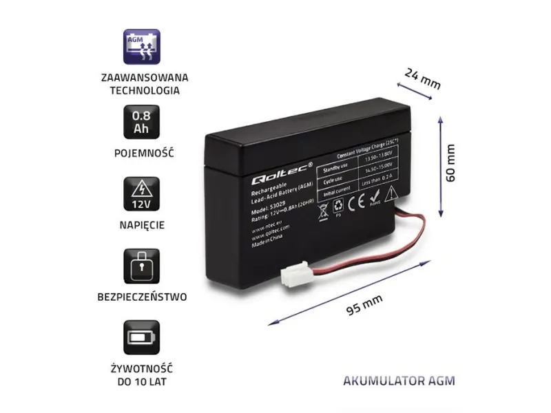 Qoltec - Batteri - Bly-syra - 800 mAh