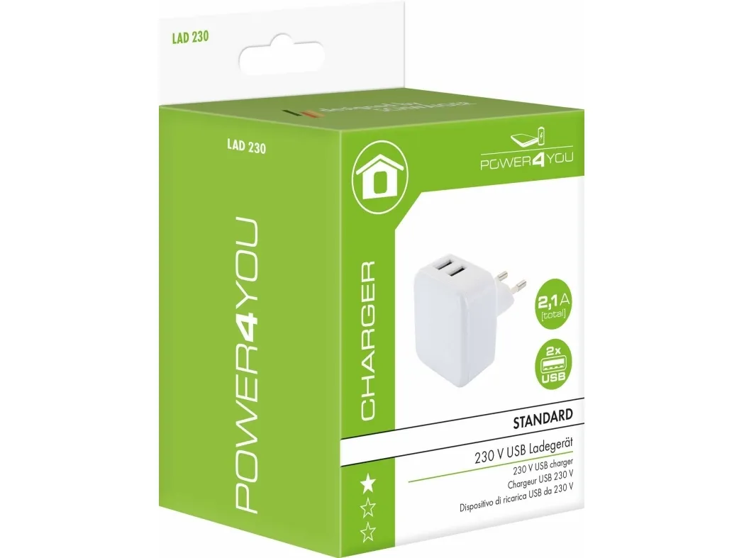 This Schwaiger charger adapter was designed for connection to a 230 V socket. It is equipped with two USB sockets which allow simultaneous charging of two devices (e.g. smartphone, tablet, camera or headphones). Simply use the USB cable of the device to be charged.