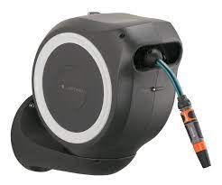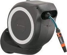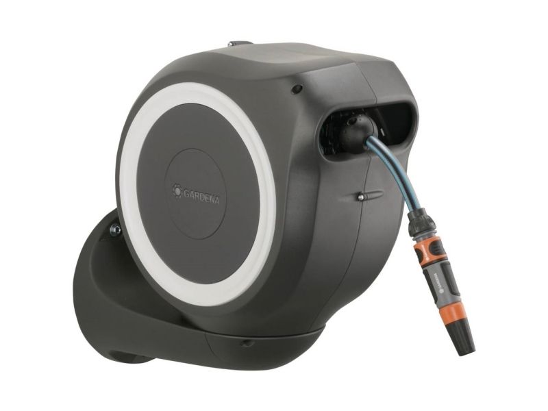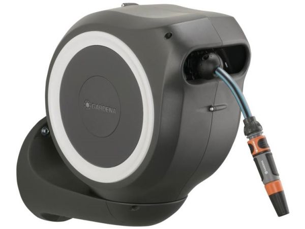 Garden watering is more convenient and effortless than ever with the Wall-Mounted Hose Box RollUp S. It helps to keep your garden tidy, organized and prevents annoying tripping hazards caused by a hose lying around. The practical hose storage is simply mounted on the wall of your house and connected to the tap with a flexible connecting hose. Thanks to the sturdy wall bracket, the hose box can be swiveled by more than 180° so that you can reach every corner of your garden effortlessly. For direct use, simply extend the garden hose to a maximum length of 15 meters. The garden hose locks automatically in particularly short intervals as soon as you stop, meaning the hose is simple and easy to handle. A light pull on the end of the hose releases the lock and a built-in steel spring with innovative RollControl technology ensures smooth and controlled retraction. The RollControl protects the hose box and surroundings from damage caused by rolling in too fast. To avoid kinks or knots in the water hose, the box has an integrated hose guide. Thanks to the hose and tap connections from the Original GARDENA System you can easily and flexibly attach an extension or other compatible GARDENA Element to the hose. You will always have your GARDENA Hose Attachments to hand. They can be attached underneath the wall bracket and can be stored there to save space. The GARDENA Wall-Mounted Hose Box is both UV- and frost-proof and can be placed on the house wall all year round without hesitation. The high-quality material offers you a long service life and usability without maintenance. In addition, the box cannot be stolen thanks to the secure anti-theft protection and can only be removed from the wall by you. Together with the Wall-Mounted Hose Box you will receive the wall bracket, a flexible connecting hose, all necessary Original GARDENA System and Assembly Parts as well as a nozzle with two different spray jet options. Watering that's always ready for action - with the GARDENA Wall-Mounted Hose Box RollUp S.