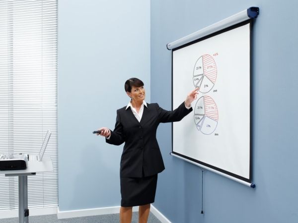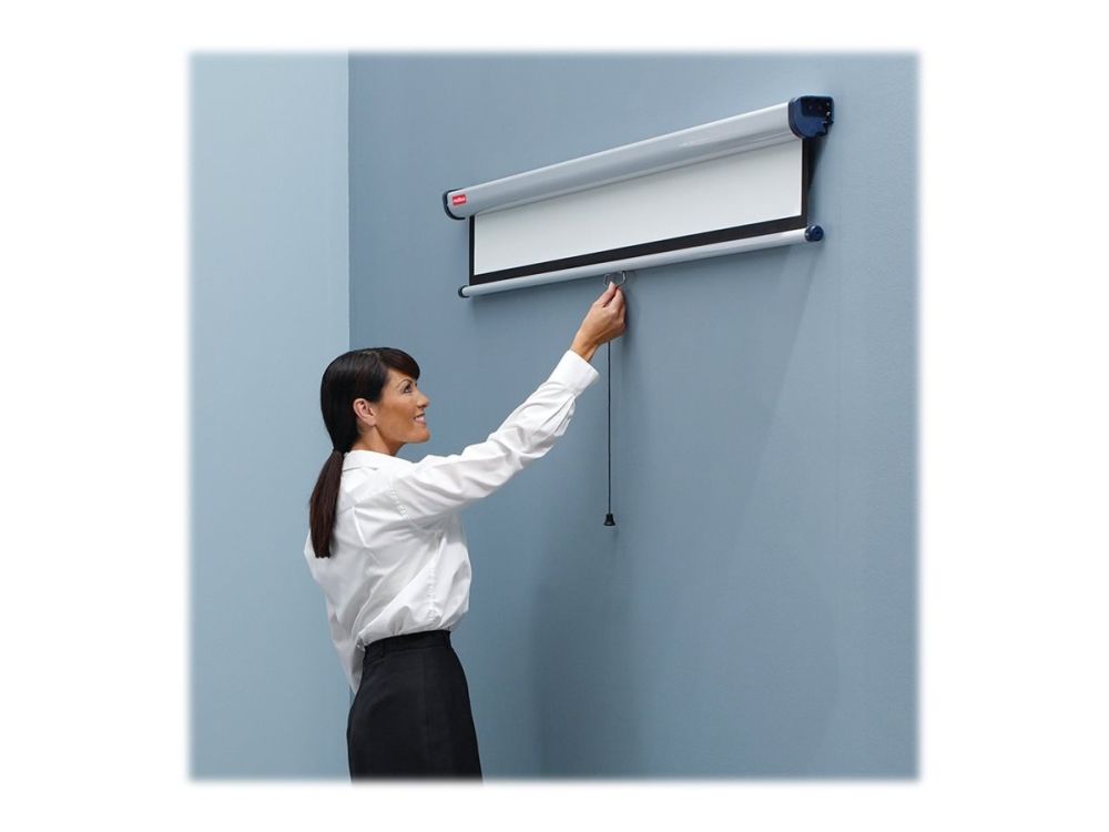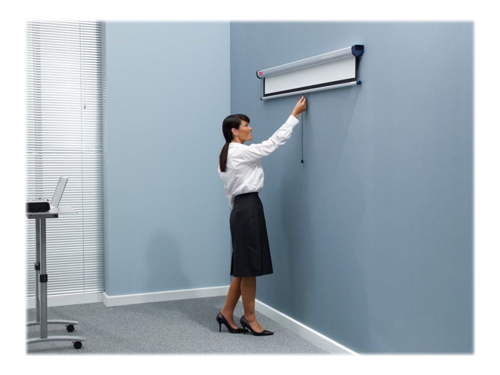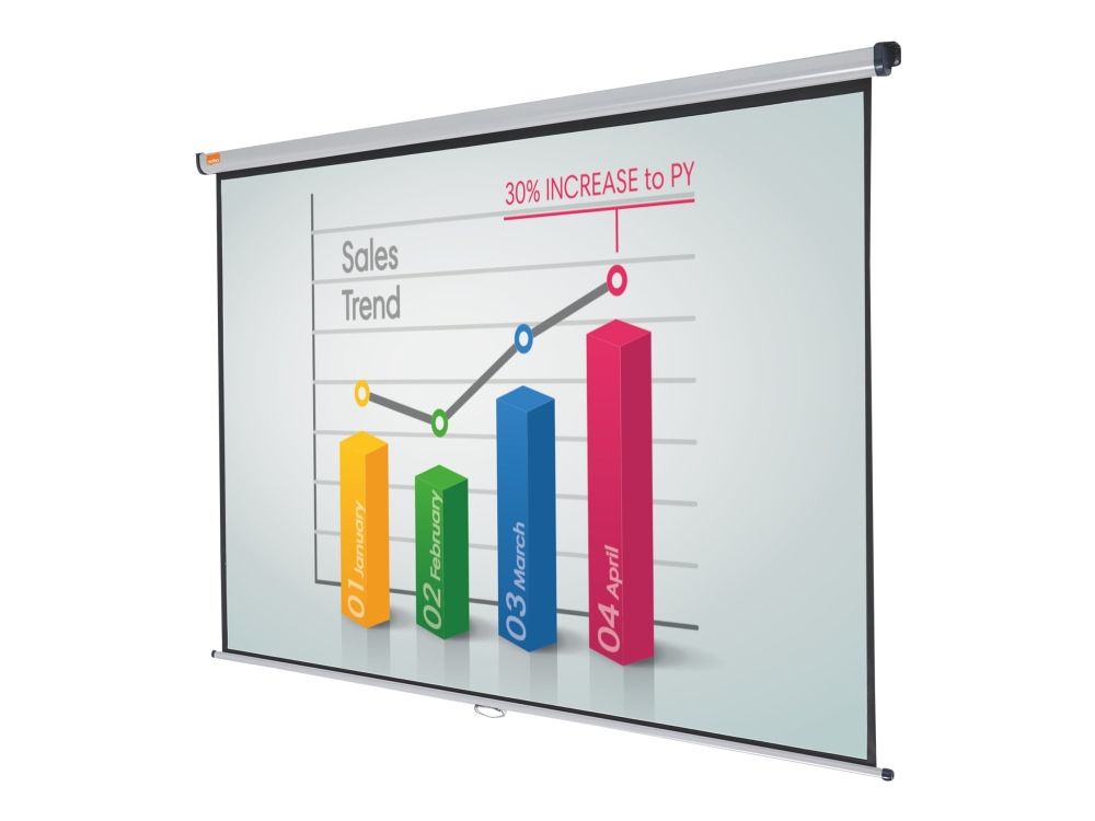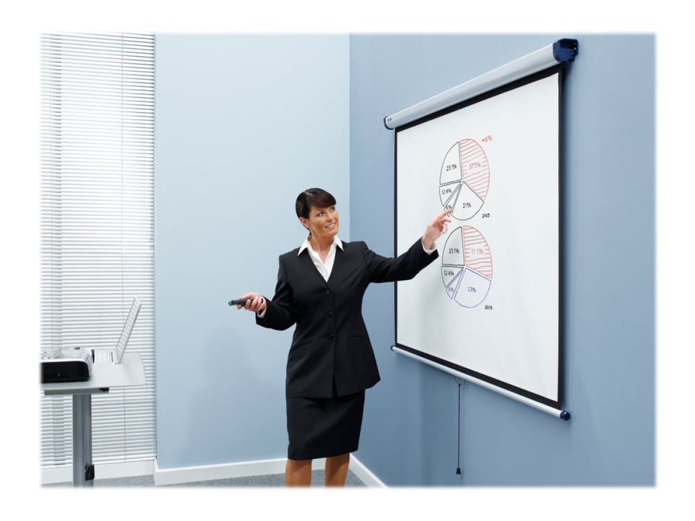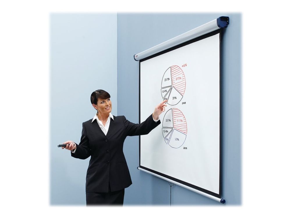 Den briljanta ytan ger en skarp, detaljerad bild som lätt kan ses av alla i publiken. Skärmen kan enkelt fällas in i sitt hölje för att skydda mot skador eller för att gömmas undan när den inte används. Med hjälp av förlängningsfästen kan skärmen monteras över en whiteboard eller lutas mot publiken.