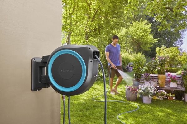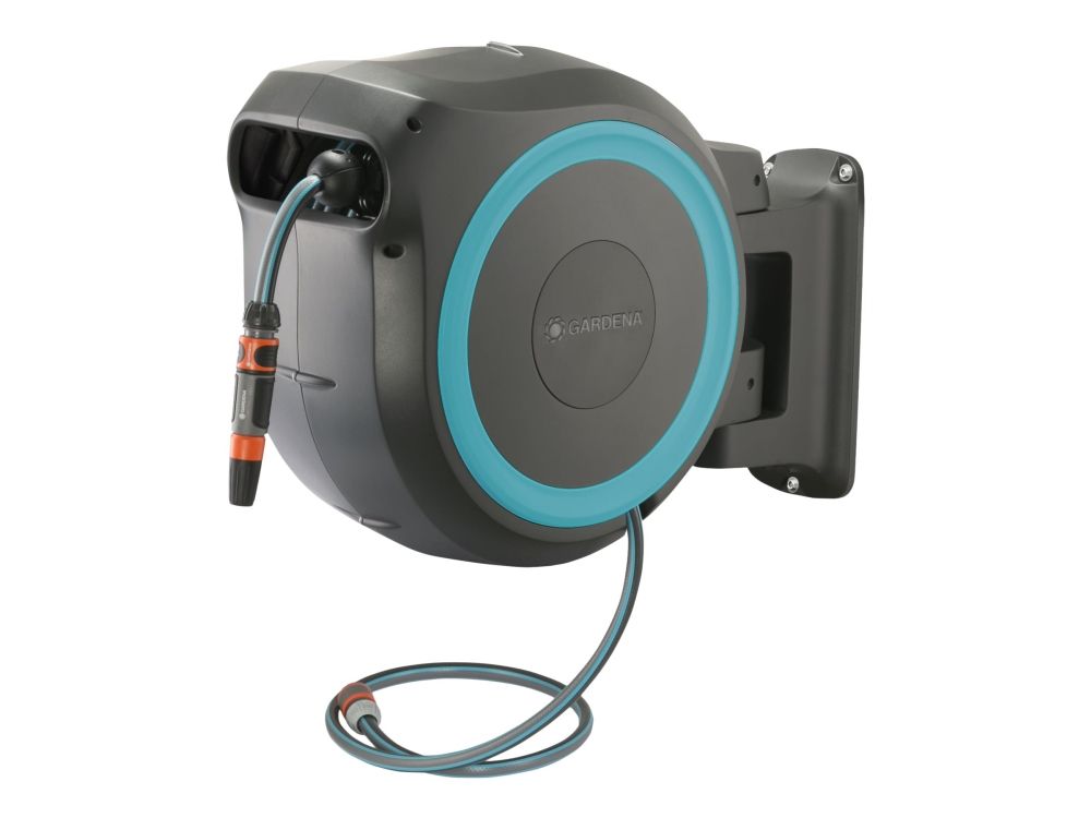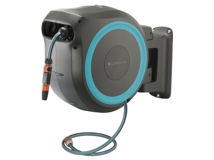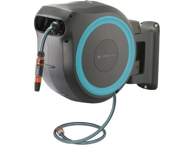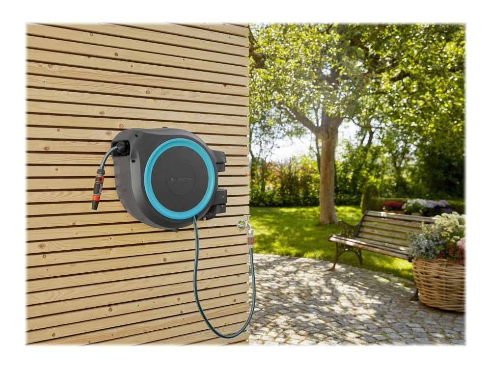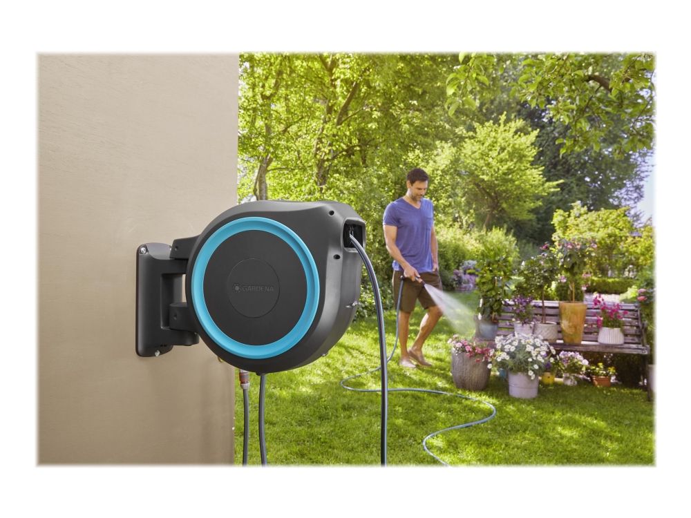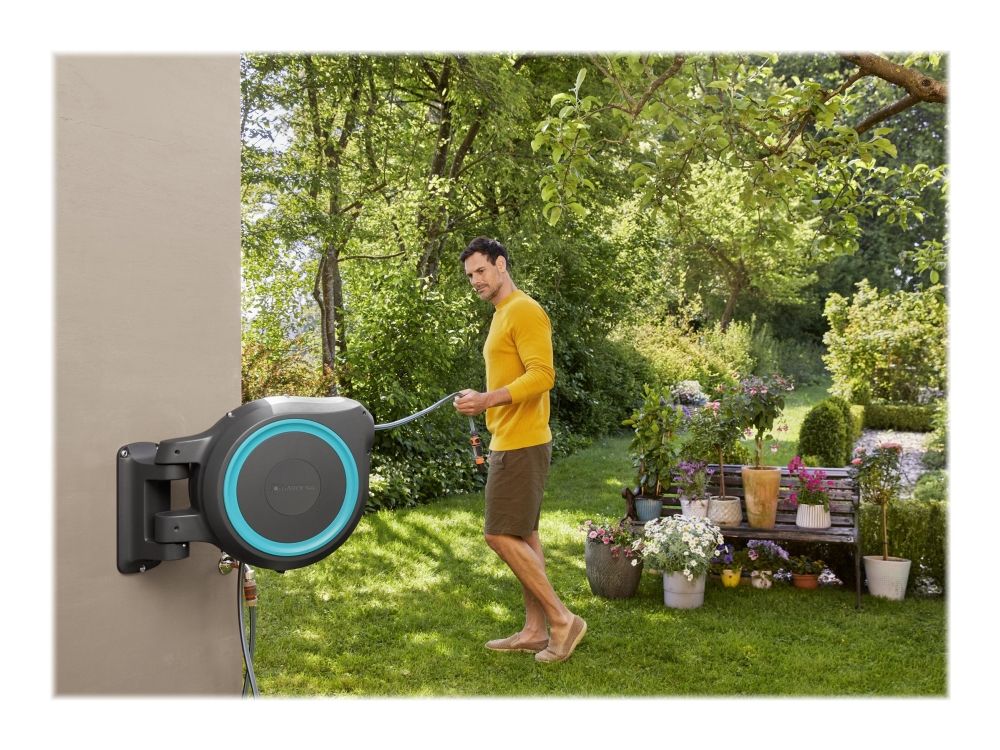 Tack vare den innovativa designen och den praktiska upprullningstekniken hos väggslangboxen RollUp M/L, ger snabbhet och användarvänlighet. Väggslangboxen rullar upp slangen på nolltid och gör att den kan förvaras säkert och utrymmes effektivt. Boxen fästs på en husvägg med ett vridbart 180°-fäste - den här rörliga leden ger maximal rörelsefrihet och stor räckvidd under vattningen. Når trädgårdens alla hörn med den långa kvalitetsslangen. Slangen rullas enkelt ut när man drar i den och låses automatiskt vid önskad längd, tack vare särskilt korta låspunkter. Ett lätt drag lossar låsningen och en integrerad fjäder drar automatiskt in slangen på ett tillförlitligt sätt. För att säkerställa att slangen dras in på ett säkert och kontrollerat sätt används RollControl-teknik i den här väggslangboxen. Den integrerade slangstyrningen säkerställer att slangen lindas upp jämnt och prydligt så att det inte finns några veck, eller böjar i slangen. Förutom alla dessa enastående egenskaper har Gardena RollUp M/L är utrustad med stöldskydd och är byggd av högkvalitativa material som är UV- och frostskyddade.