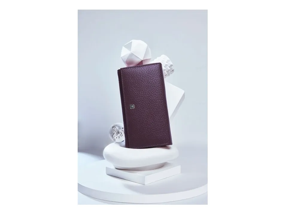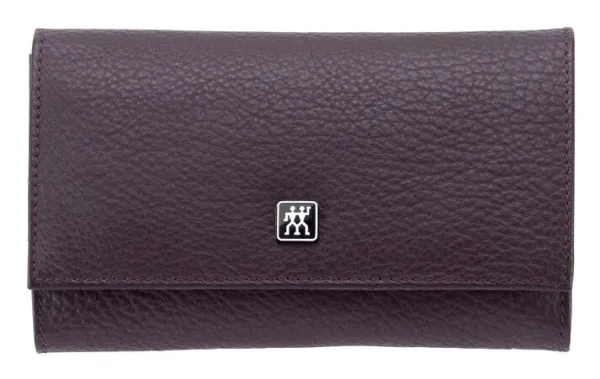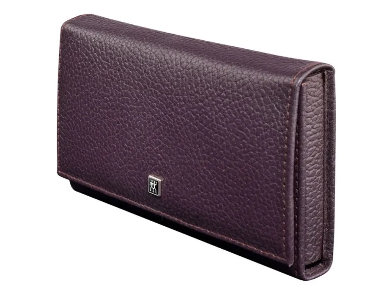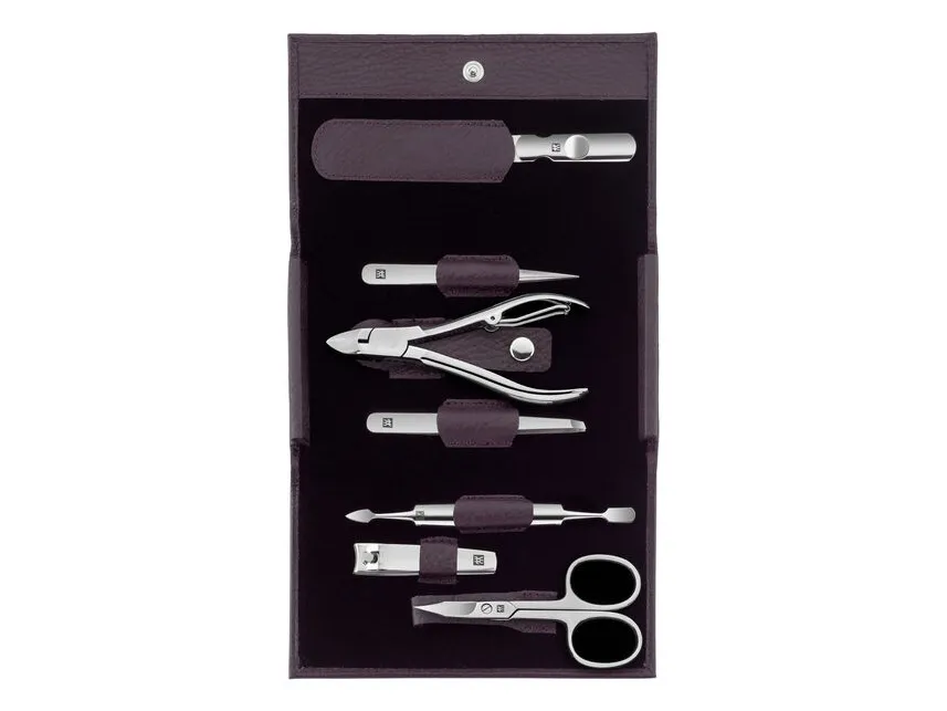 Sapphire nail file (130 mm), nail nippers, combination nail scissors, purple calf leather case with snap fastener, pointed tweezers (90 mm), nail clippers, pointed tweezers, twin instrument, slanted tweezers