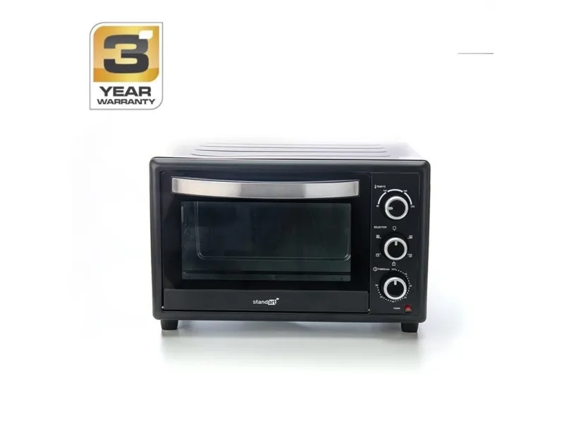 Brand- Standart. Model- KR-101L-28(BC). Width- 49.8 cm. Depth- 32.8 cm. Height- 36.5 cm. Weight- 7.92 kg. Volume- 28 l. Colour- Black. Power- 1500 W. Operating temperature- 90 - 230°C. Control- Mechanical. With lighting- Yes. Number of functions- 5. Functions- Top and bottom heating with convection. Top heating with convection. Top and bottom heating. Top heating with rotisserie. Top heating with convection and rotisserie.. Screen- No. Timer- Yes. Automatic shutdown- Yes. Thermostat- No. Overheat protection- Yes. Contents- Enameled tin. Grids. Crumb tray. Skewer.. Mandatory warranty- 24 mo. Additional information- 60 minutes timer Non-stick interior coating. Double door glass..