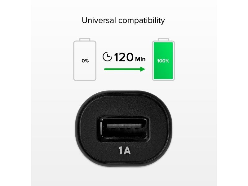 The compact size power supply has a 1A universal USB output: simply connect the charger connector to your car's cigarette lighter and the USB cable to the appropriate socket of your smartphone.