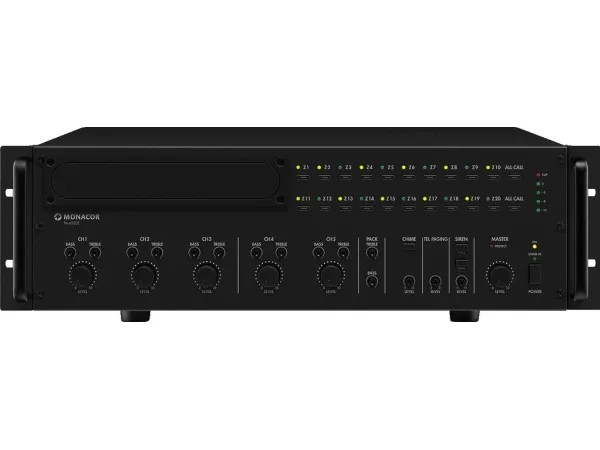 20-zoners ELA-mono-kombiforstærkerBas-, diskant- og masterregulator, signal-/clip-visning med LED'er, reguleret blæser · pladser til forskellige funktioner fås som ekstraudstyr · 15-V-fantomforsyning til elektret-mikrofoner · tilslutning til op til 32 kommandomikrofoner PA-2400RC · tilslutning til op til 3 PTT-mikrofoner PA-4300PTT · alarm-meddelelse med indskub PA-1120DMT (fås som ekstraudstyr) · net- og 24-V-nødstrømsdrift · monteringsvinkel kan tages af1 X 600 W 20 zoner, kan kobles enkeltvis 3 indgange mikrofon/line via kombibøsninger 2 indgange stereo-line via phono-bøsninger Klokke, varigheds- og hyletone, auto-mute, 2-lyd- eller 4-lyd-klokke kan indstilles