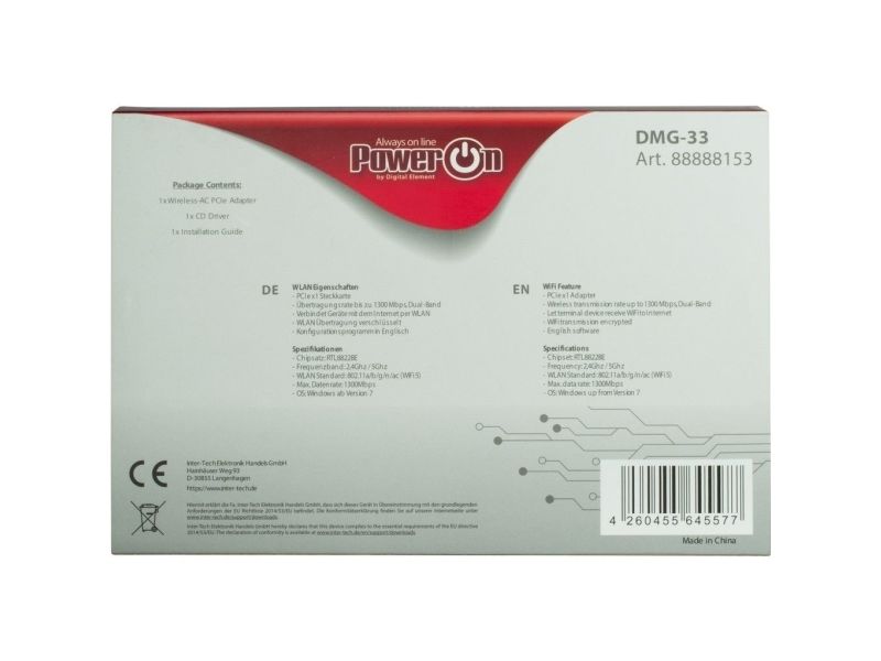Inter-Tech DMG-33 är utformad för att förbättra din nätverksupplevelse med effektiva anslutningsmöjligheter. Med dubbla 3 dBi-antenner ger den här nätverksadaptern tillförlitliga och robusta trådlösa anslutningar. Med en dataöverföringshastighet på 1300 Mbps stöder den olika protokoll inklusive IEEE 802.11b, IEEE 802.11a, IEEE 802.11g, IEEE 802.11n och IEEE 802.11ac, vilket garanterar kompatibilitet med en rad olika enheter. Detta plug-in-kort använder PCI Express x1-gränssnitt för installation och prestanda.
