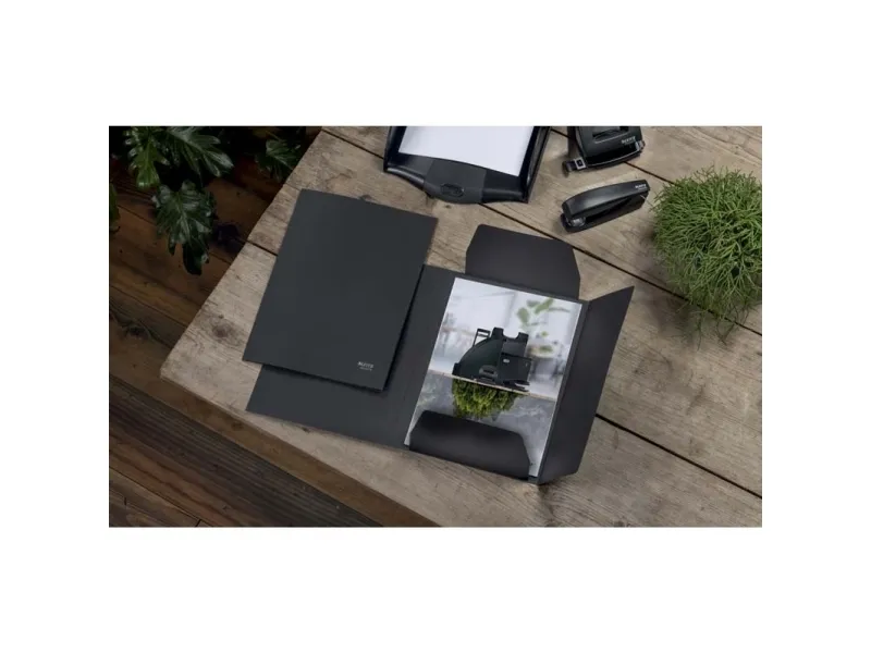 The Leitz 3-flap folder is a testament to sustainable and efficient document storage. Designed for those who seek environmental integrity and practicality in their office supplies, this folder is made entirely from recycled materials, aligning with high standards of eco-friendliness as certified by the Blue Angel Ecolabel. Its durable construction, with a material weight of 430 g/m2, ensures durability and protection for your documents, making it a reliable choice for everyday use. With a capacity to hold up to 250 A4 sheets, it offers ample space for your filing needs, while the product's size of 242 x 318 mm makes it an ideal fit for standard documents. Whether for personal or professional use, the Leitz 3-flap folder is designed to meet the demands of modern filing and storage, combining sustainability with functionality.