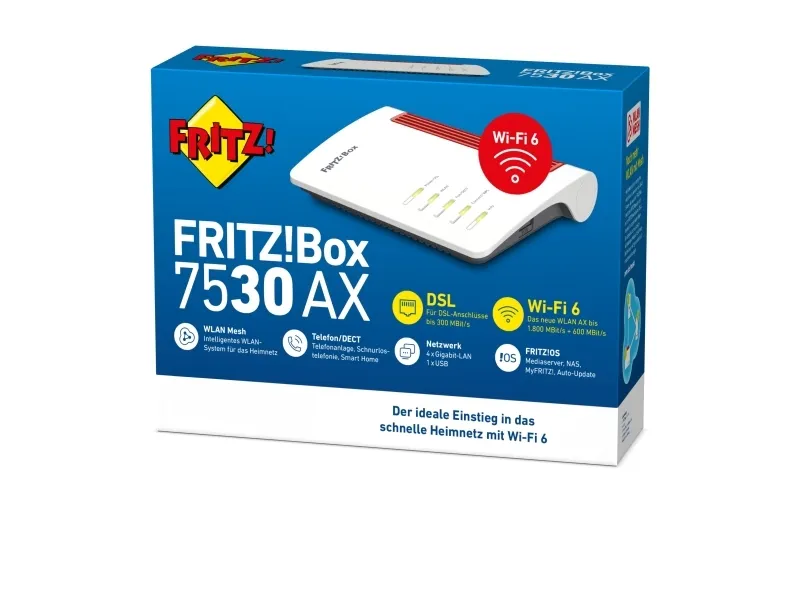 AVM FRITZ!Box 7530 AX är en mångsidig nätverkslösning som kombinerar DSL-modem och trådlösa routerfunktioner med robusta telefonifunktioner. Enheten stöder ADSL-, VDSL- och Vplus 35b-digitala signalprotokoll, vilket ger snabb och tillförlitlig Internetanslutning med en maximal överföringshastighet på 300 Mbps. Den har Wi-Fi 6-teknik och erbjuder trådlös anslutning med dubbla band med hastigheter på upp till 1800 Mbps för 5 GHz och 600 Mbps för 2,4 GHz, vilket gör den lämplig för hem med flera användare och anslutna enheter.