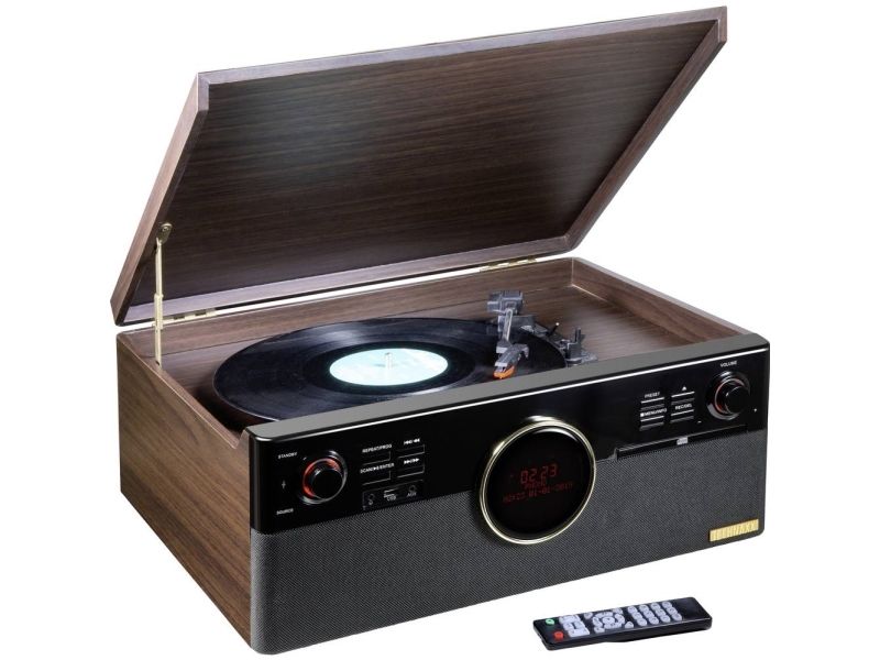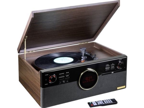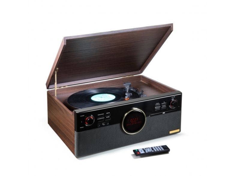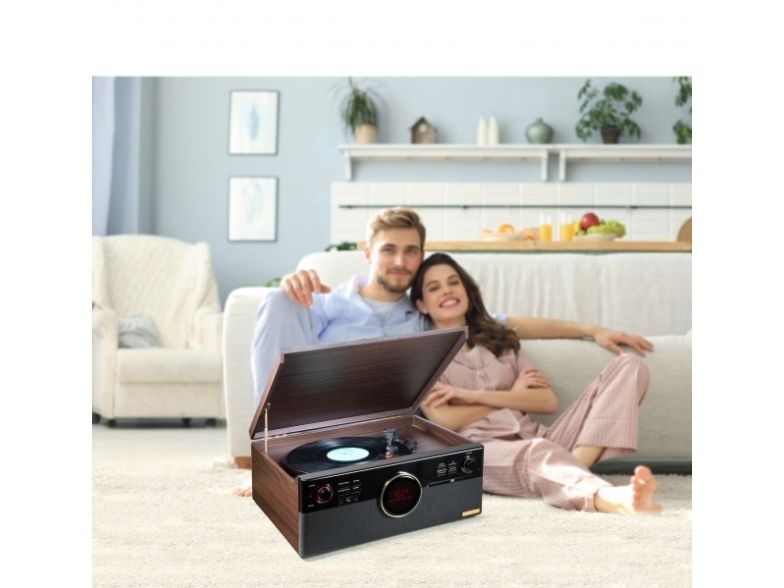 - Digitizing vinyl records/cassette/CD/radio or AUX–IN to USB up to 32GB - Music playback & recording via Bluetooth 5.0 - Playback of MP3/WMA music files from USB/CD/ /Bluetooth devices - No computer/notebook required - RCA output for connection to HiFi systems - Record player with automatic/manual stop & 3 speeds: 33, 45, 78rpm - Built-in stereo loudspeakers - Built-in cassette & CD players - Built-in FM/DAB+ radio - 3.5mm AUX–IN & 3.5mm headphone jack - High quality design with functional handling