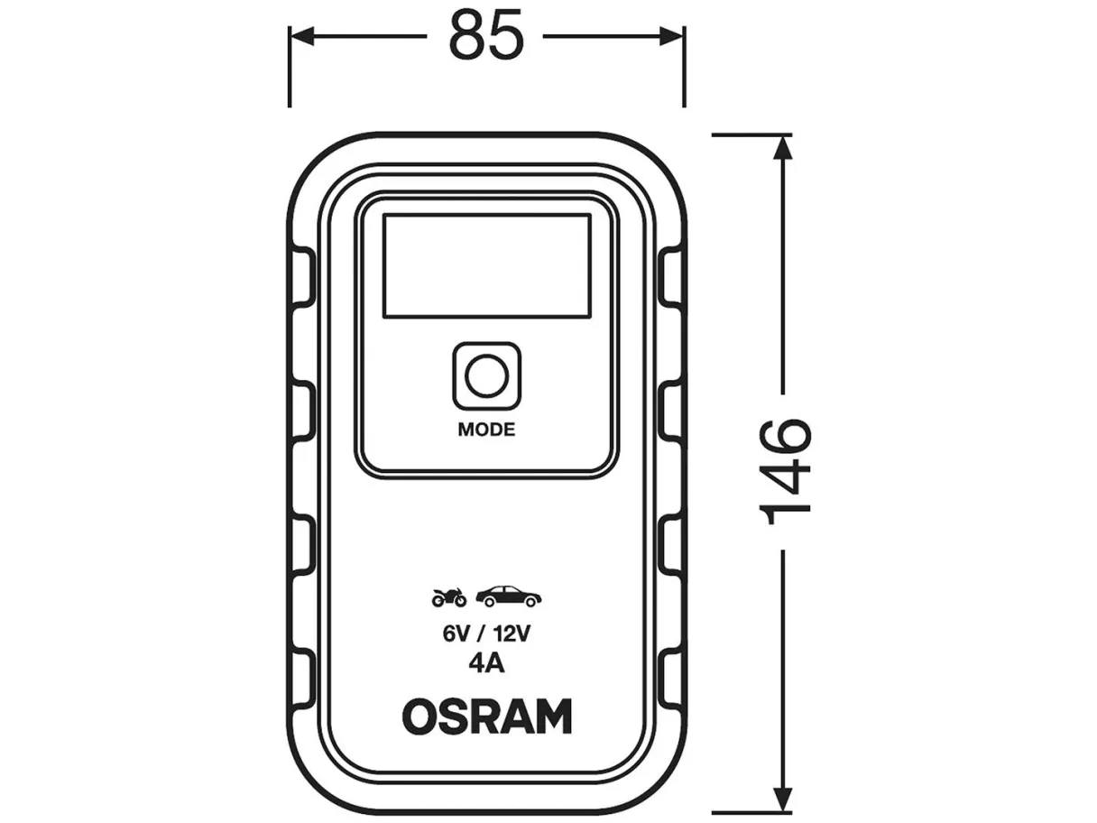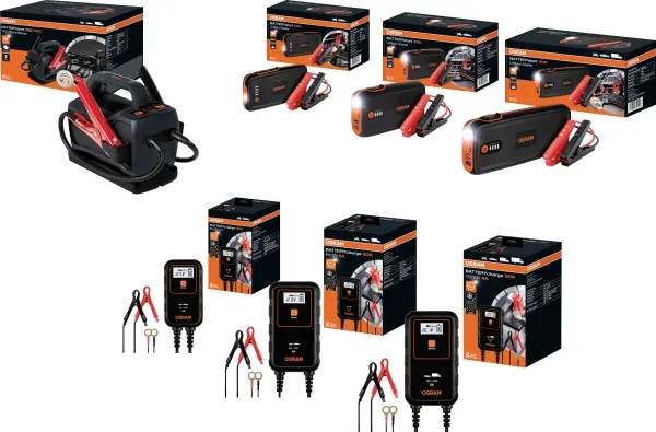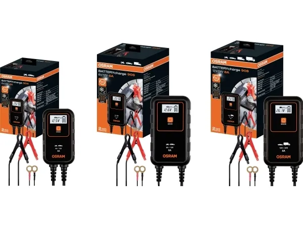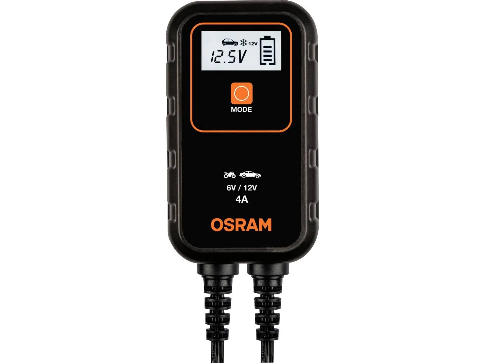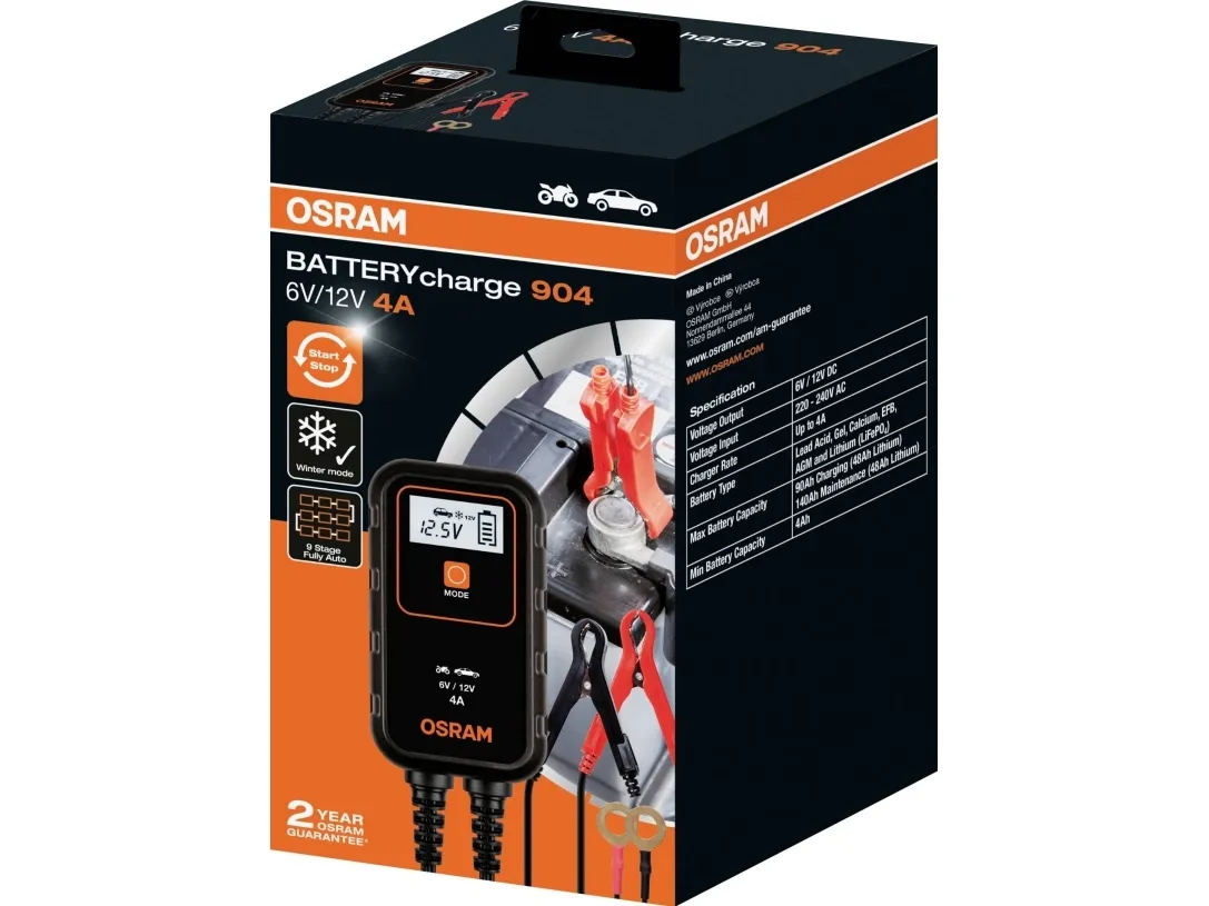 på OSRAM BATTERYcharger 904 er en intelligent 4A-oplader og en batterivedligeholdelsesenhed til 6V- til 12V-køretøjer som motorcykler og de fleste mindre køretøjer. Ved et tryk på en knap startes der en 7-trins opladningscyklus til lithiumbatterier og til bly-syre-/AGM-batterier en 9-trins opladningscyklus. Tilslut blot med viden om, at opladeren venter på bilbatteriet: Det tænder automatisk i langtidsvedligeholdelsestilstand, når batteriet er fuldt opladet. Har et digitalt display til forenkling af ladeprocessen og en lang række sikkerhedsfunktioner inklusive beskyttelse mod omvendt polaritet og overspændingsbeskyttelse.