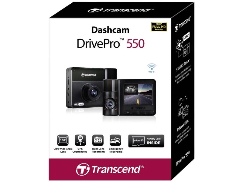 Transcend's DrivePro 550 is a dual lens dash camera that provides both drivers and passengers with optimum protection. The front lens features a STARVIS image sensor and wide field of view for capturing crystal-clear Full HD 1080P videos at 60fps, while the 180° rotatable rear lens is equipped with an Exmor sensor and four Infrared LEDs, allowing sharp in-car video recordings at night and in low light conditions.