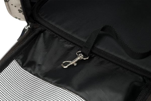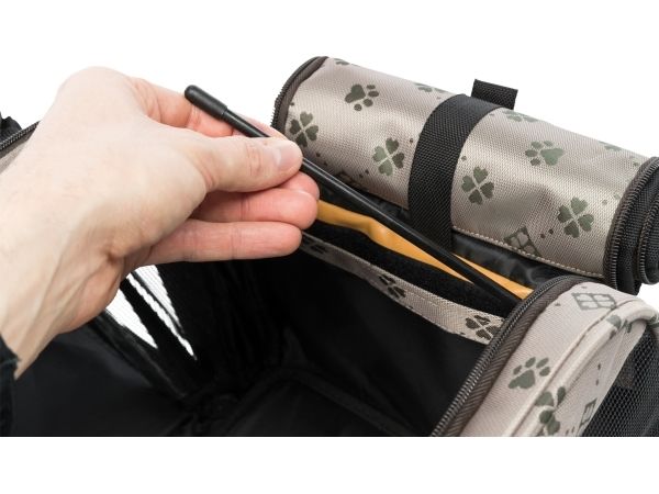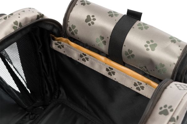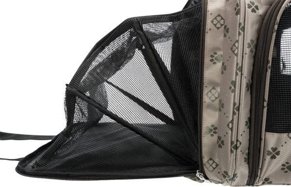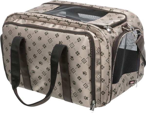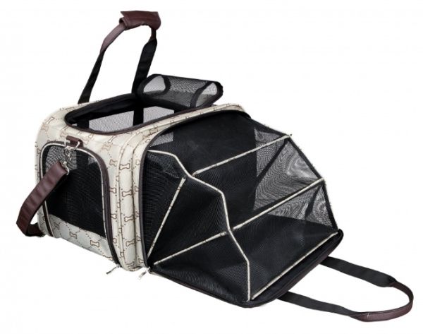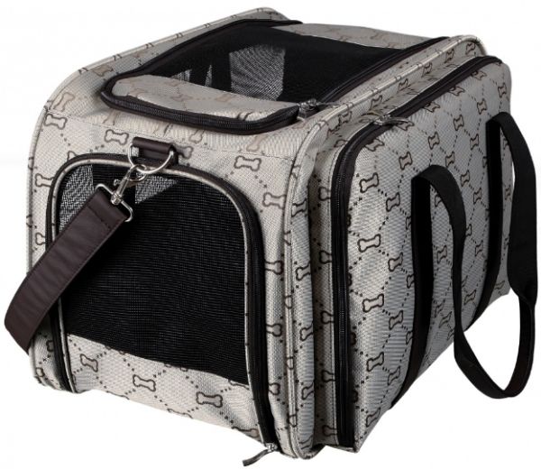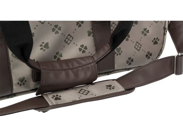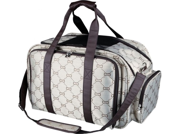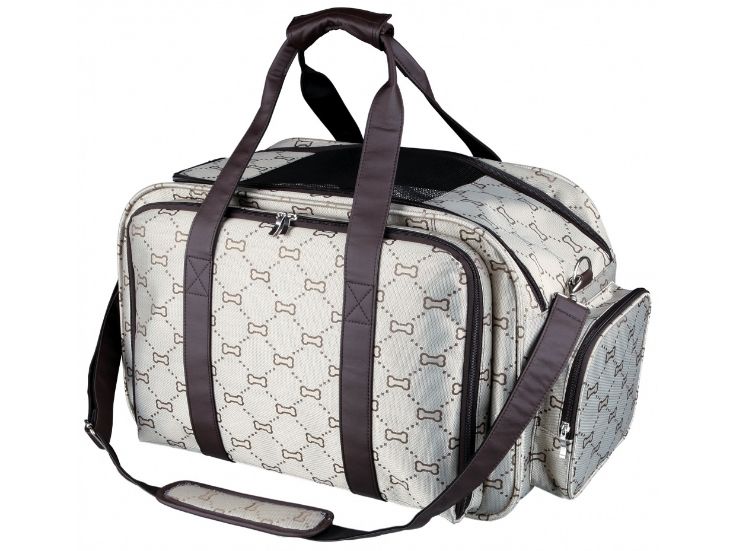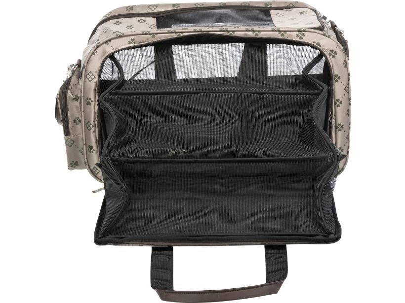 - jacquard - polyester cover - lying area can be expanded to twice its size by folding down side pocket - can be opened at the front and top - with pocket - removable, adjustable shoulder strap - short leash prevents the pet from jumping out - with net inserts for good air circulation - padded bottom plate, removable - colour: beige/brown