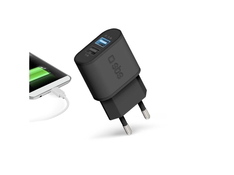 The charger is equipped with two universal USB outputs for 1A and 2.1A smartphones. In this way, you can complete a full charge of two devices at the same time: just connect the European plug to a wall socket and the cables from your devices to the USB outputs