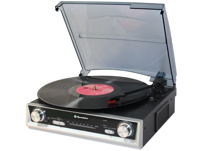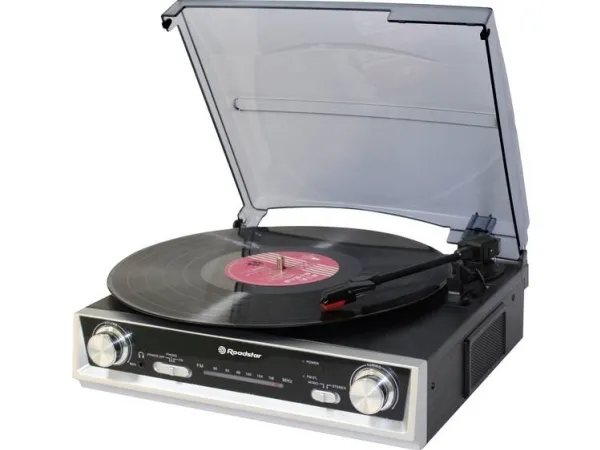 Roadstar TTR-8634. Product colour: Black, Silver, Turntable speeds: 33,45,78 RPM, Volume control: Rotary. Headphone connectivity: 3.5 mm. AC adapter input voltage: 230 V. Width: 310 mm, Depth: 290 mm, Height: 125 mm