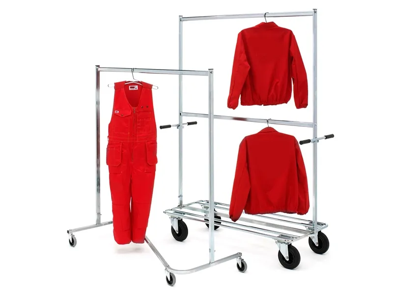 Klädhängare modell ZETA med 2 nivåer för upphängning. Levereras med fyra vridbara hjul Ø100 mm. Z-ramen är byggd så att hyllorna lätt kan skjutas in i varandra för förvaring, så att de tar så lite plats som möjligt. Mått: 2000 x 660 x 1530 mm.
