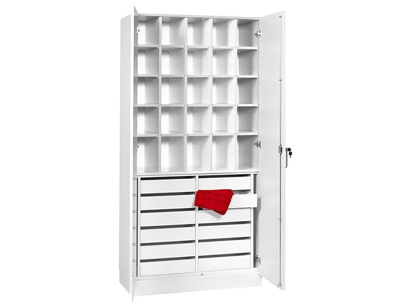 Förvaringsskåp i björklaminat med h x b x d = 2100 x 1000 x 470 mm, avsett för förvaring av sytillbehör. Mora förvaringsskåp är ett robust sortiment av skåp och hyllor, främst avsedda för användning i skolor, förskolor, vård- och utbildningsinstitutioner. Som standard tillverkas Mora-skåpen i vit, björk- eller boklaminat, dörrarna är låsbara.