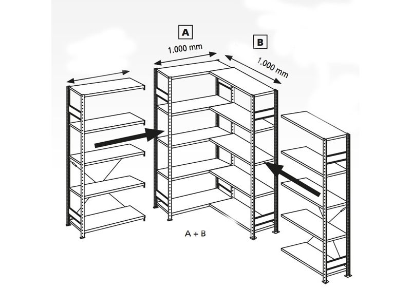 Boltless hjørnereol med højde 2500 mm, bredde 1000 x 1600 mm og hyldedybde 600 mm. Kapacitet er 150 kg/hylde og 1400 kg samlet kapacitet for hele hjørnereolen.Komplet hjørnesektion til Boltless lagerreol, sørger for at du får udnyttet en større del af dit areal og at der ikke bliver tomrum i hjørnerne. Denne hjørnereol, består af et 1000 mm bredt fag med hylder placeret i tværgående hyldebjælker, her navngivet hylde Type A. I 90 grader på denne reol, placeres så en reol (navngivet hyldetype B), hvor den ene siden af hylden hænges i konsoller i modstående hylde. Her får du løsningen for optimal udnyttelse af lagerlokalet. Med udgangspunkt i et hjørnemodul, kan der bygges på i det uendelige; benytte følgefag for optimaliseret opbevaring og kapacitet, enten med rygkryds eller hyldebjælker, og tilpasset ønsket hyldedybde. Hjørnereolerne indeholder 1000 mm brede hylder, således at samlet bredde bliver 1000 mm i den ene retning og 1000 mm + modstående hyldedybde i vinklen. Smart, ikke san
