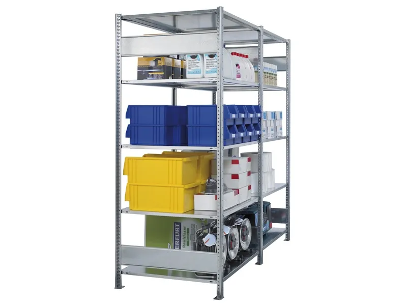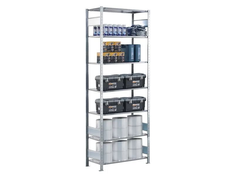 Komplet startfag af Boltless lagerreol med 7 hylder i højden, hyldebjælker (L-stag), Højde 3000 mm, bredde 750 mm og hyldedybde 800 mm. Kapacitet pr. hylde er 250 kg, samlet kapacitet for en komplet sektion er 1800 kg.For at gøre det let for dig at bestille din nye lagerreol, har vi sammensat et komplet startfag (startsektion), bestående af 7 stk. hylder og 2 stk. komplette stiger. Skal du bestille lagerreoler som skal stå efter hinanden, sidevejs, begynder du med et startfag i ønsket bredde, højde og dybde. Så bygger du på med det antal af følgefag (følgesektioner), med samme dybde og højde, som er nødvendig for at få den ønskede total længde på reolen. Bestil løse hylder med samme dybde i tillæg, hvis du ønsker flere hylder end der indgår som standard.Denne Boltless lagerreol monteres uden rygkryds, men med hyldebjælker (L-stag) som sikrer en rigtig god afstiving af reolen. Dette sikrer praktisk betjening fra begge sider af reolen, mulighed for lagring af gennemgående gods samt hurti
