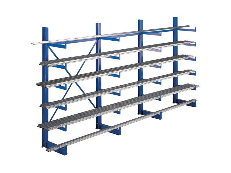 Grenställ för lägre belastning. Rackhöjd 2000 mm, c/c bredd mellan stolparna 1250 mm. Grenlängd 500 mm - med stopp (grenar svetsade). Max belastning per gren 200 kg. Färg: RAL 5010, blå. Levereras komplett - 5 grenar + fot i höjdled.