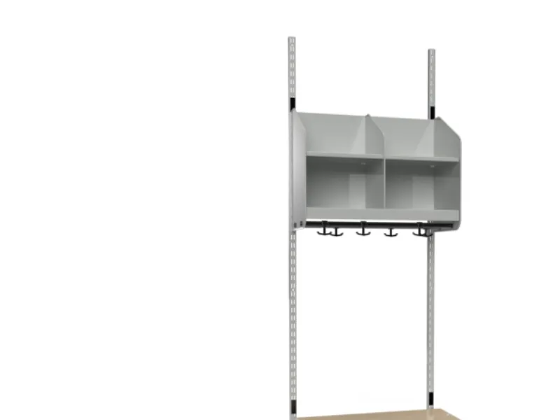 BST kombination C. Garderobens startsektion med 2 platser och bänk. Garderob och skohylla med skiljeväggar i pulverlackerad vit metall, RAL 9010. Bänk med sits i björk högtryckslaminat. 2 väggskenor och garderobsskena med 6 förankringskrokar. Platsbredd 300 mm och totalbredd 615 mm.