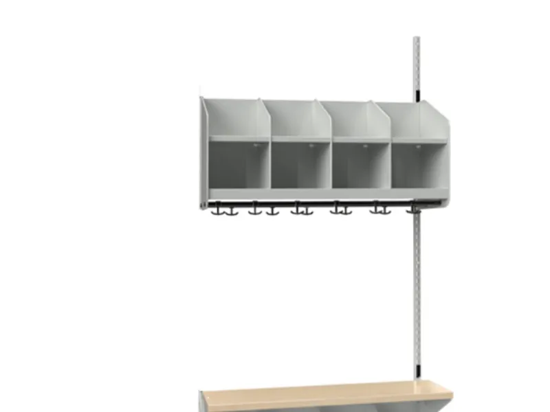 BST kombination C. Garderobsförlängningsdel med 4 platser och bänk. Garderob och skohylla med skiljeväggar i pulverlackerad grön metall, RAL 6021. Bänk med sittplats i björk högtryckslaminat. 1 väggskena och garderobsskena med 12 förankringskrokar. Sittbredd 250 mm och total bredd 1015 mm.