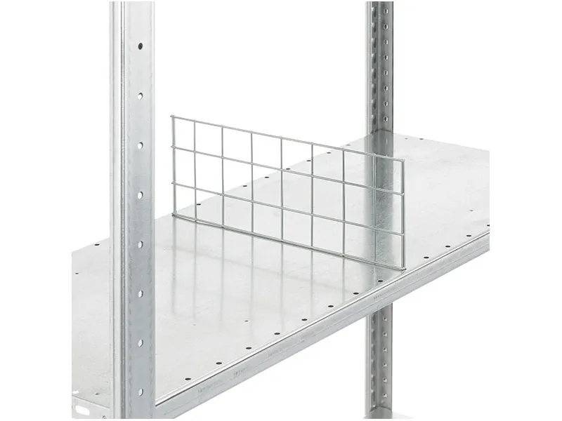 Praktisk hyllfördelare för placering på Boltless-hylla, 150 kg och djup 300 mm. Den Boltless-fördelaren levereras i bakplåt Galv. och med en maskvidd på 45 x 50 mm.