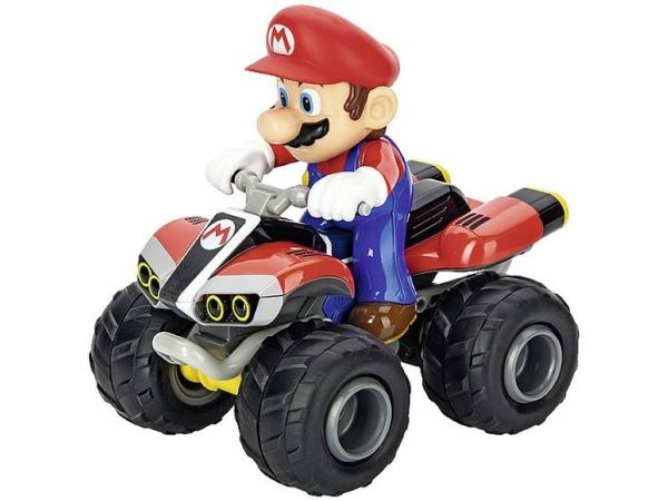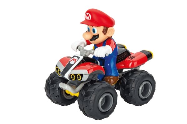 Carrera RC Mario Quad - Carrera RC Quad - Join Mario out on the track - Length approx. 19.5 cm - NEW with a 3.2 V 700 mAh LiFePo4 battery - Age 6 and upwards Watch out for the blue shell! Mario's in a rough-road rush! Join the cult video hero with his 1:20-scale Carrera RC Quad and rock the off-road world. Enjoy the thrills of real off-screen Mario Kart races with your favourite driver - in the garden, in the park or the sandpit. Mario's a big hit with collectors, too. Red-hot racing with Mario, the people's plumber Giant-size pneumatic tyres take our small-scale heroes across truly tough terrain. The original Nintendo reproduction license guarantees the former plumber is almost indistinguishable from his digital role model. Drivers of 6 years and up can already indulge in great racing action in the 19.4 cm long speed machine thanks to beginner-friendly control technology. Top speeds of up to 9 km/h mean Mario is ideal for outdoor trips and lounge-circuit championships lasting up to 30 minutes. Then the 3.2 V 700 mAh LiFePo4 battery is hooked up to the USB cable included in the box for a 50-minute recharge.