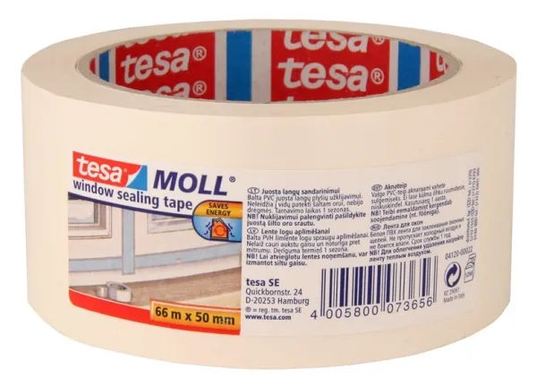 Brand- Tesa. Material- Polyethylene (PE). Colour- White. Application of the tape- , . Length- 66 m. Width- 50 mm. Temperature resistance- 1 - 50°C. Adhesive- Yes.